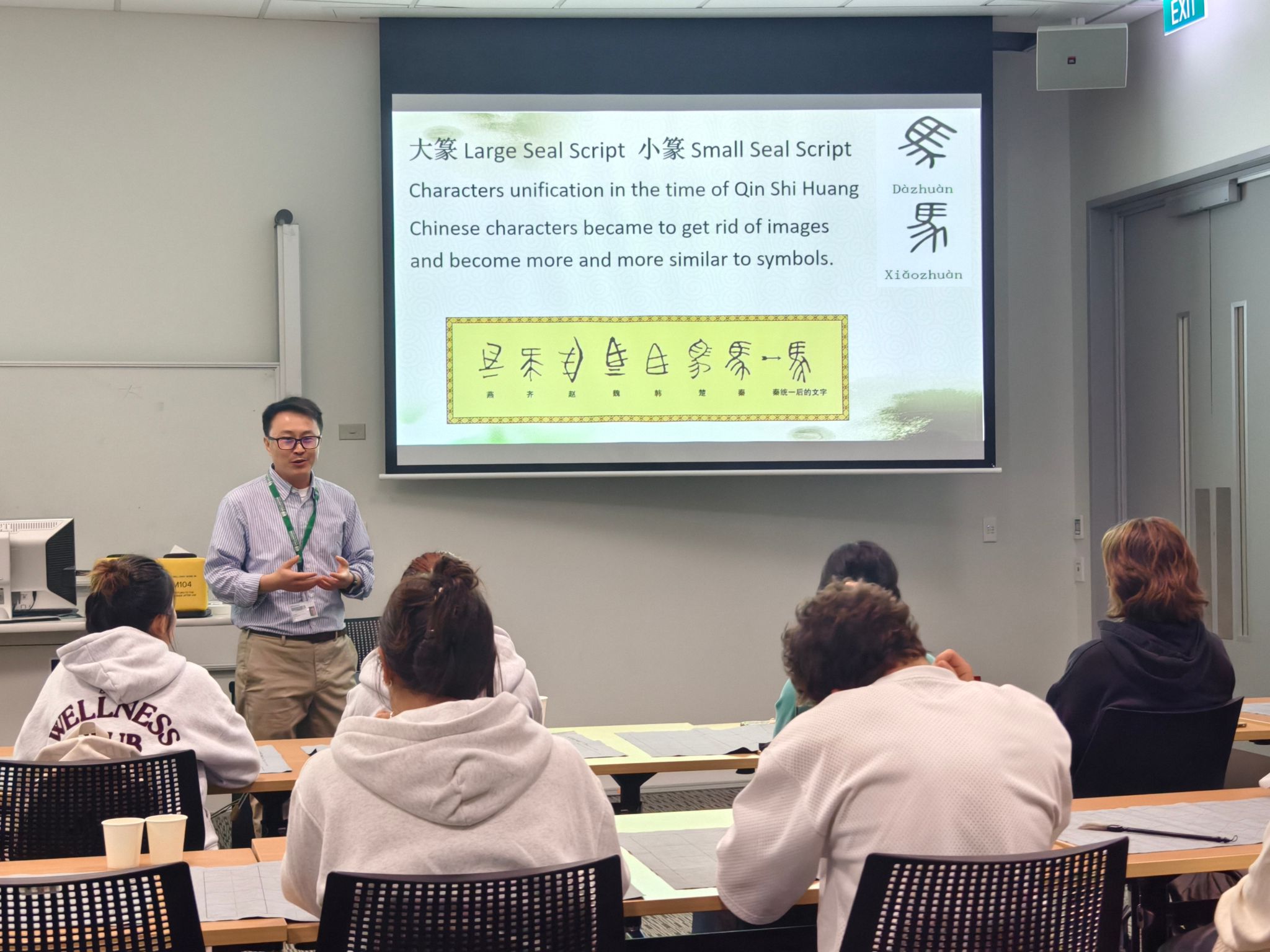 孔院公派教师康国旗为学生们讲解了汉字的起源与演变,从甲骨文、金文到楷书的发展历程娓娓道来,带领大家走进汉字背后的历史与美学,并引导学生们欣赏了不同时代和风格的书法作品,帮助学生体会书法中蕴含的节奏、气韵与个性表达。