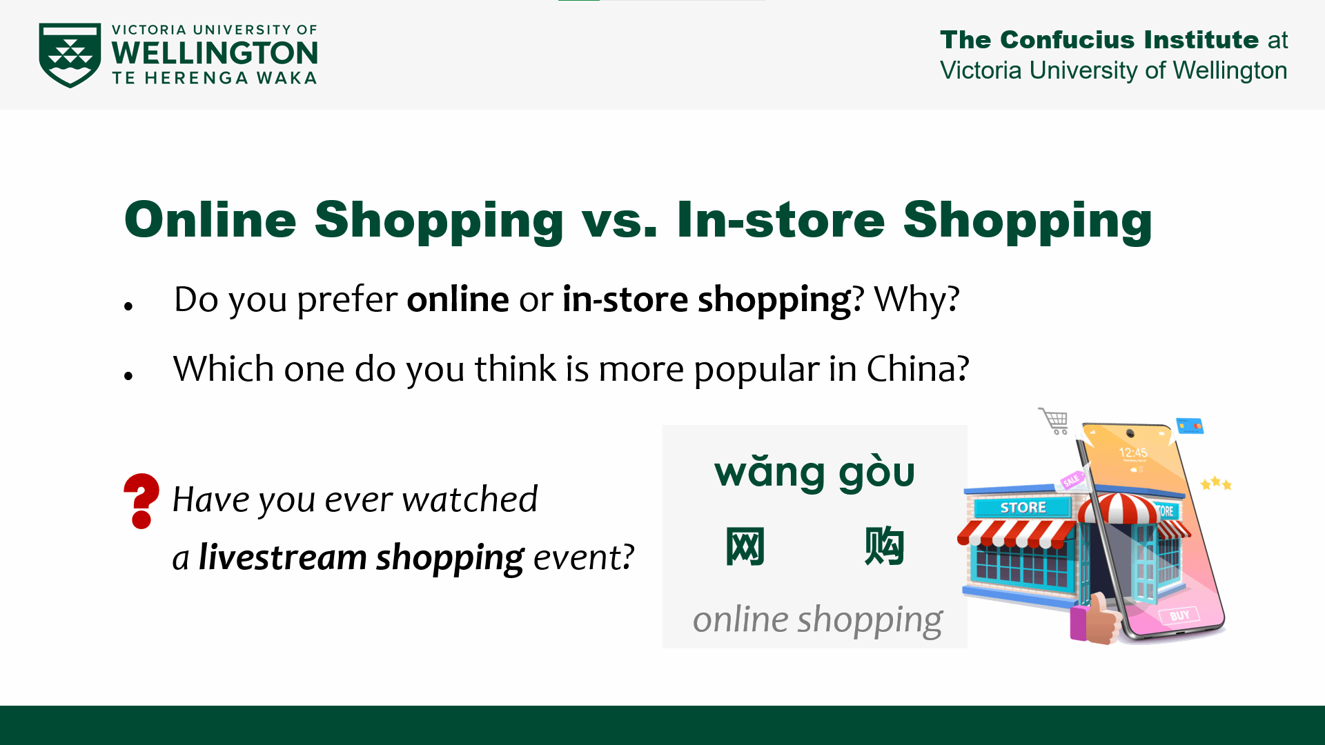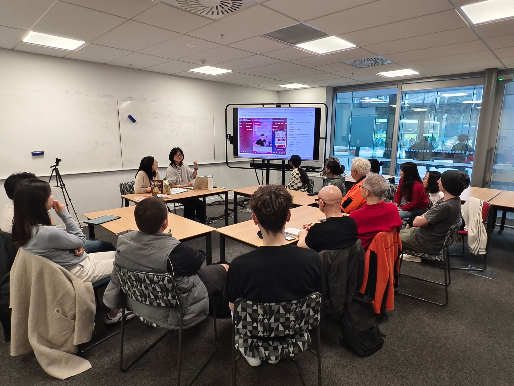 活动伊始,王思尧通过组织中文自我介绍营造了轻松的交流氛围,随后以 “购物” 为话题引导参与者围绕购物时间、方式及消费习惯展开讨论,大家积极分享线上线下购物经历。活动引入 “直播带货” 这一新兴购物方式,王思尧结合淘宝直播网页实例介绍其概念与销售场景。参与者提出 “假发”“鱼类生鲜” 等关键词,她现场搜索播放相关直播内容,带领大家观察主播语言、技巧及互动方式。更有参与者通过直播平台远程与主播互动提问,沉浸式体验 “云购物”。体验后,她引导众人分析中国直播带货迅猛发展的原因,并对比新西兰本地物流、制造业、人口规模等因素讨论新西兰直播带货的可能性,参与者展现出较高的文化思辨能力。