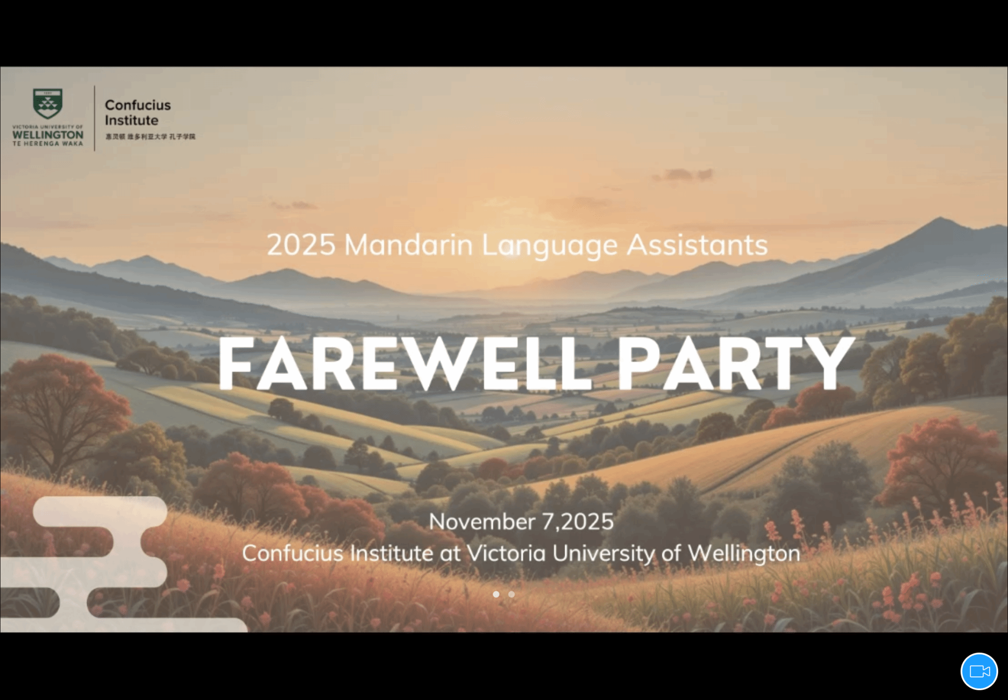 告别会由志愿者们制作的视频展开(志愿者秦浩宇剪辑),从惠灵顿、罗托鲁瓦、新普利茅斯再到陶朗加,展示了24个志愿者教师10个月来关于教学与生活的点点滴滴。镜头流转间,既有志愿者们在课堂上认真教学中文的身影,也有在新西兰美丽风景间的欢笑足迹。一帧一幕,生动见证了每位志愿者的成长足迹与美好回忆。