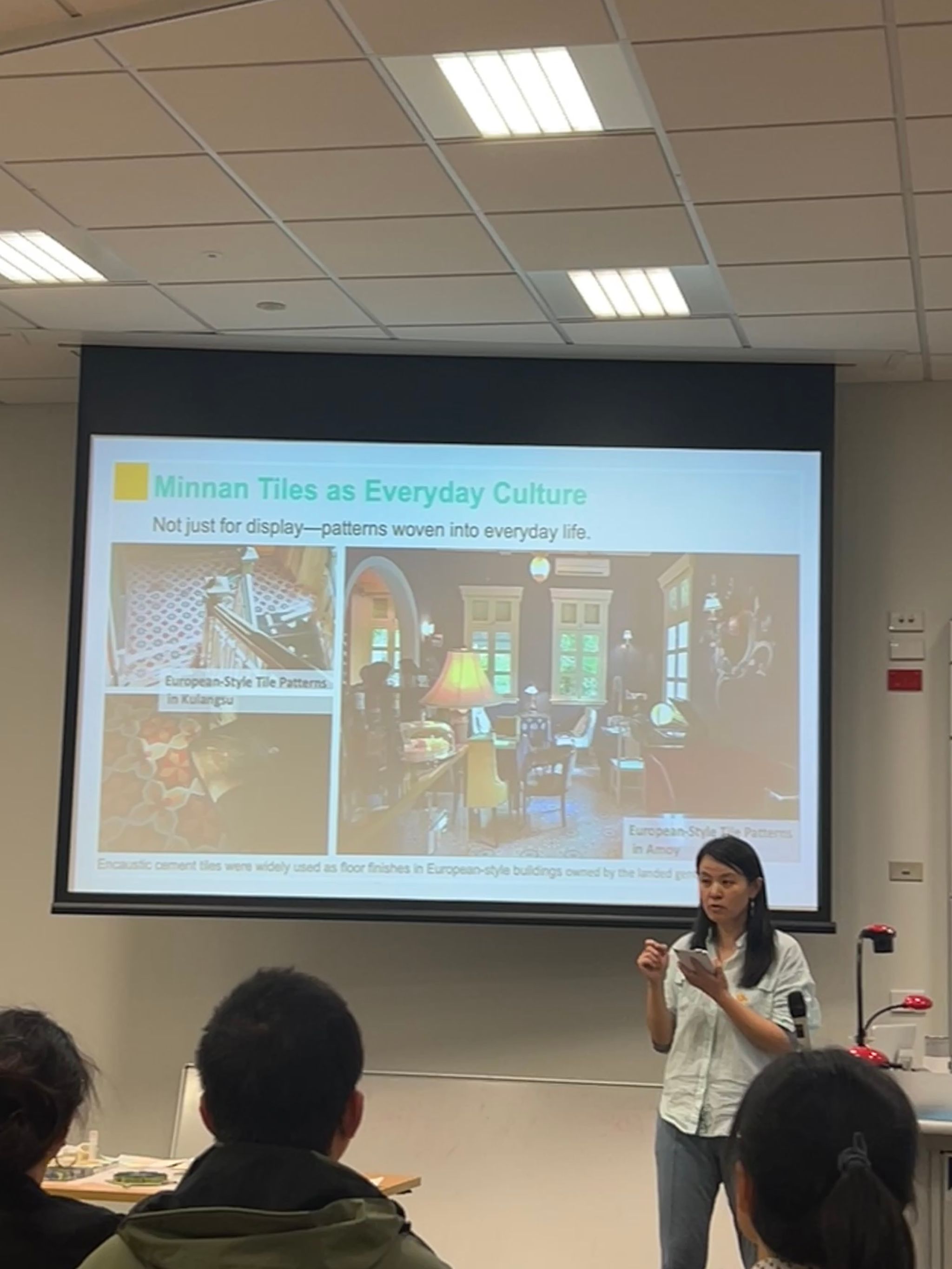 工作坊首先介绍了中国福建闽南地区传统建筑中的瓷砖装饰艺术。刘芳通过图片和案例,讲解了闽南建筑瓷砖常见的几何纹样、植物纹样以及装饰构图方式,并结合传统建筑实例,介绍了这些纹样在建筑装饰中的应用以及所体现的文化与审美特点。同时展示了从中国带来的闽南传统瓷砖实物及制作模具,并介绍了相关制作工艺。参与者通过近距离观察瓷砖材料和模具,对传统建筑装饰的制作过程有了更具体的认识。在实践体验环节。参与者通过闽南瓷砖纹样拓印的方式,观察和体验传统瓷砖图案的结构与对称形式,加深了对闽南建筑装饰纹样特点的理解。