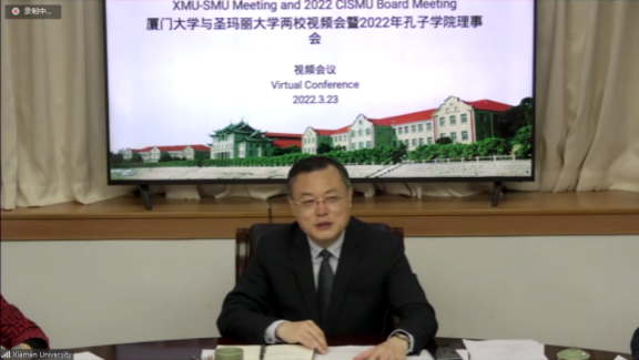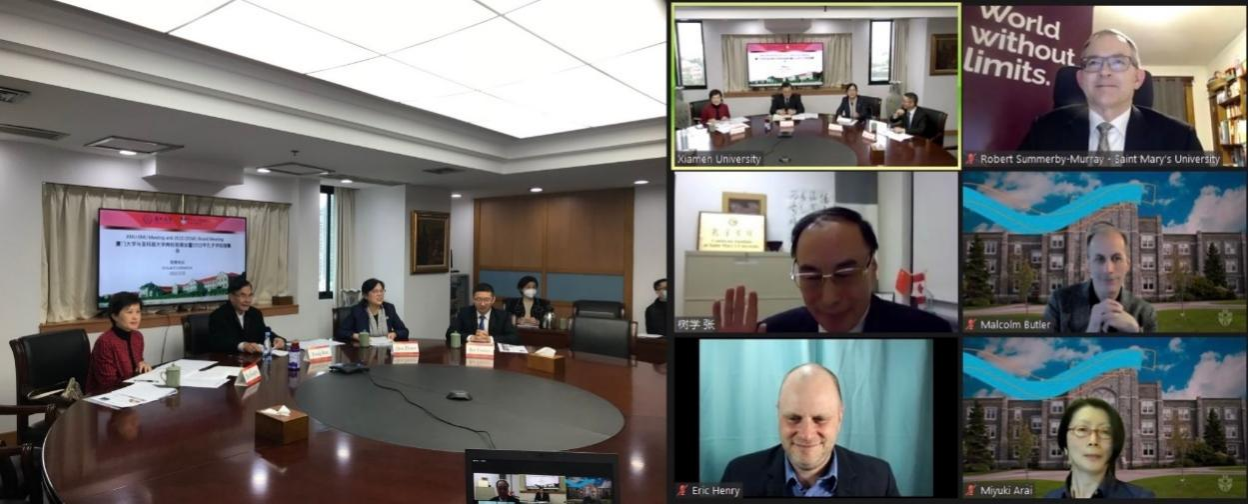 3月23日8点,两校领导实现了近年来第一线上会晤。孔子学院共建大学厦门大学校长张荣、副校长杨斌,加拿大圣玛丽大学校长罗伯特·夏莫比·墨理(Robert Summerby-Murray)及副校长马尔科姆·巴特勒(Malcolm Butler)出席两校视频会暨孔子学院年度理事会。会议由国际中文教育学院/海外教育学院院长陈志伟院长主持。国际合作与交流处、管理学院、孔子学院、圣玛丽大学等单位相关负责人参会。