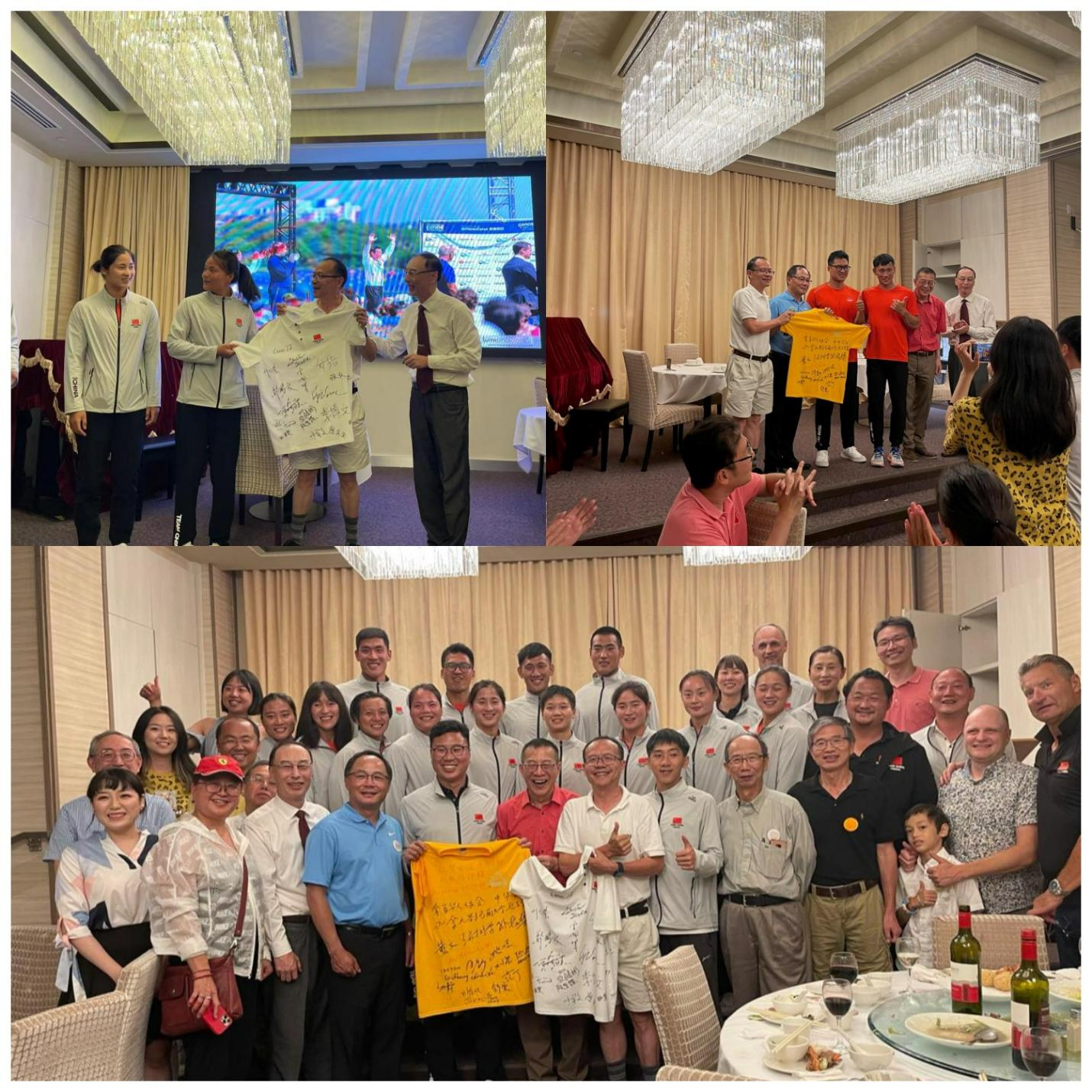 晚会结束后,中国皮划艇队向华协、中华会馆和圣玛丽大学孔院赠送了由队员签名的队服,当地社团代表当地华人华侨也回赠了由华人代表签名的T恤衫。为了记住这个时刻,孔院、华协和中华会馆代表与中国皮划艇国家队的领导、教练和队员等集体合影留念。