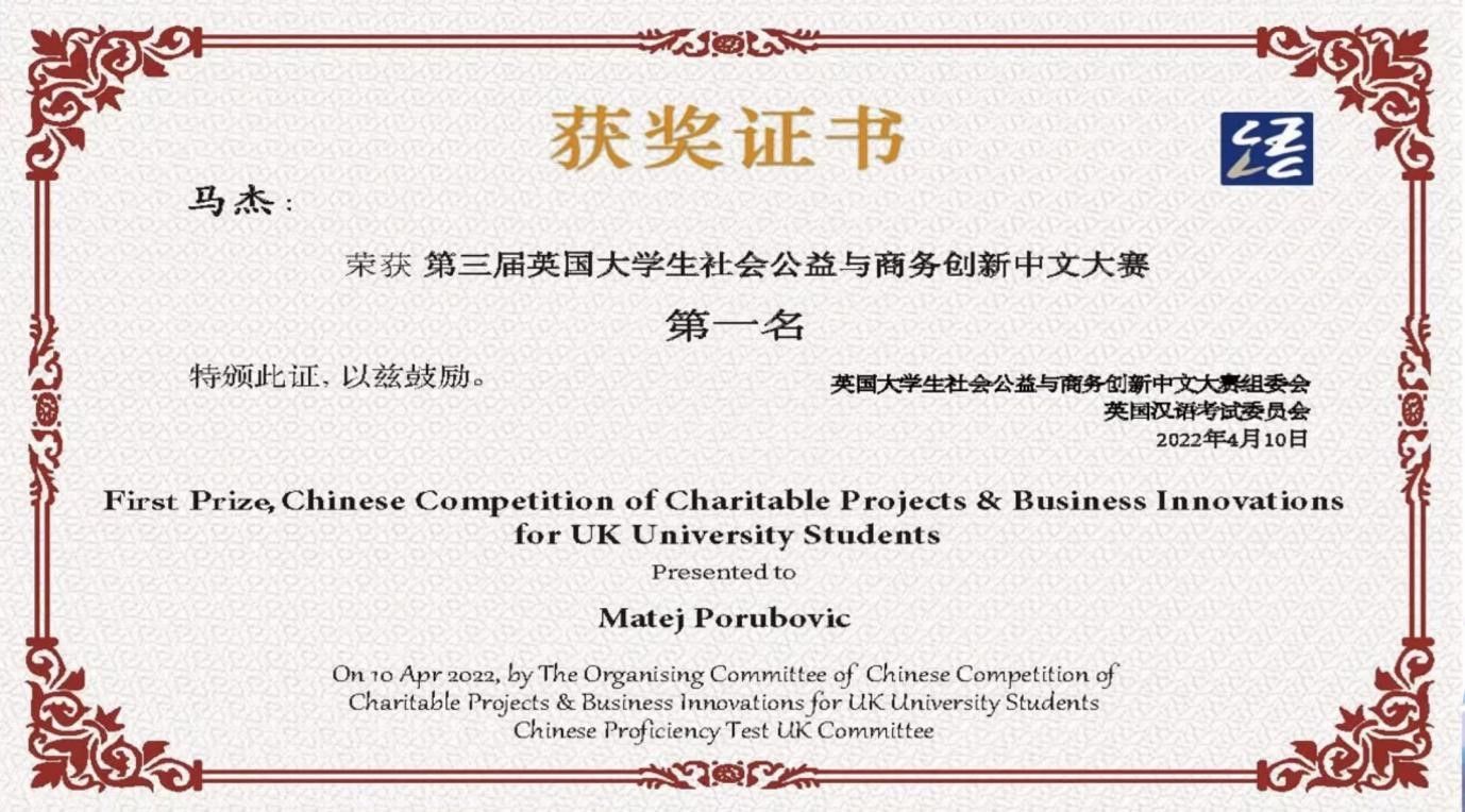 2022年4月10日,由英国大学生社会公益与商务创新中文大赛组委会、英国汉语考试委员会、中外语言交流合作中心英国代表处(CLEC UK)联合举办的“2022英国大学生社会公益与商务创新中文大赛”在zoom平台隆重举行。南安孔院参赛选手马杰取得了第一名的好成绩。