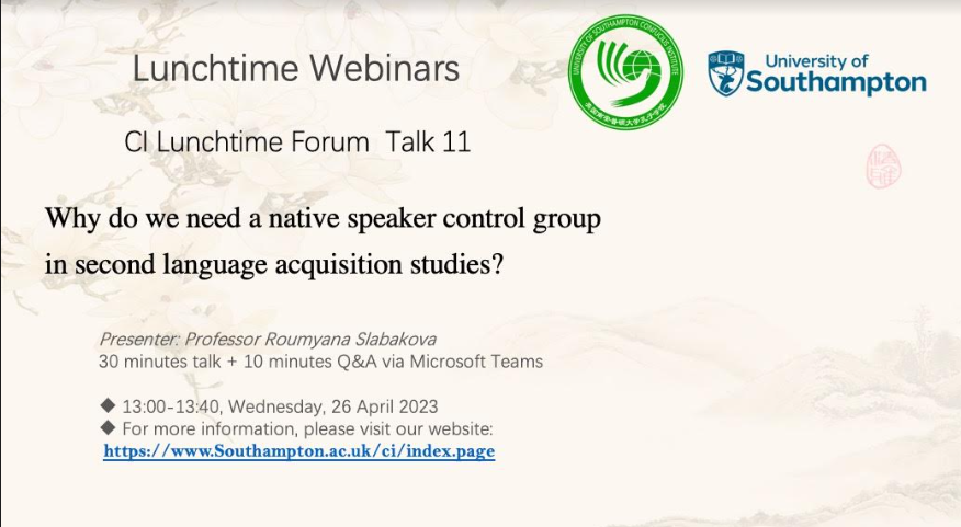 当地时间4月26日,南安普顿大学孔子学院举办了今年第三场午间线上学术讲座。本场讲题为《为什么二语习得研究需要母语对照组》(Why do we need a native speaker control group in second language acquisition studies?)。本场讲座在Microsoft teams平台举行,由孔院核心教师傅瑛老师主持,主讲嘉宾为南安普顿大学人文学院的Roumyana Slabakova教授。