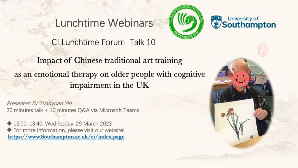 当地时间3月29日,南安普顿大学孔子学院举办了今年第二场午间线上学术讲座。本场讲座题目为《中国传统艺术训练作为情绪疗法对英国认知障碍老年人的影响》(Impact of Chinese traditional art training as an emotional therapy on older people with cognitive impairment in the UK),主讲嘉宾为英国南安普顿大学温彻斯特艺术学院设计系的Yuanyuan Yin博士。