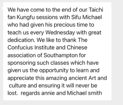 本期太极扇课程反响热烈,好评如潮。课程结束后,学员们纷纷对黄教授的授课和孔院的组织做出了高度评价。学员Alex表示,黄教授极具热心、耐心和奉献精神,学员们收获颇丰;学员Annie 和 Michael smith盛赞中国武术为“令人惊叹的古老艺术与文化”,同时对黄教授的辛勤工作表示感谢,也感谢孔院为大家提供了学习太极扇的宝贵机会。