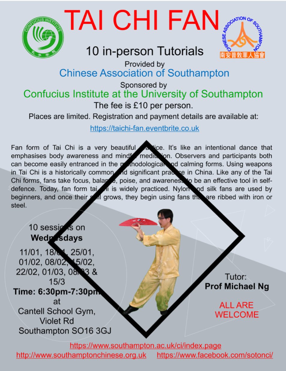 当地时间3月15日,南安孔院中华武术系列课程之太极扇课程圆满结课。此课程由南安普顿大学孔子学院和南安普顿华人协会合办,授课教师为南安普顿大学电子电气工程学院教授、南安普顿华人协会会长黄嵩钧博士。