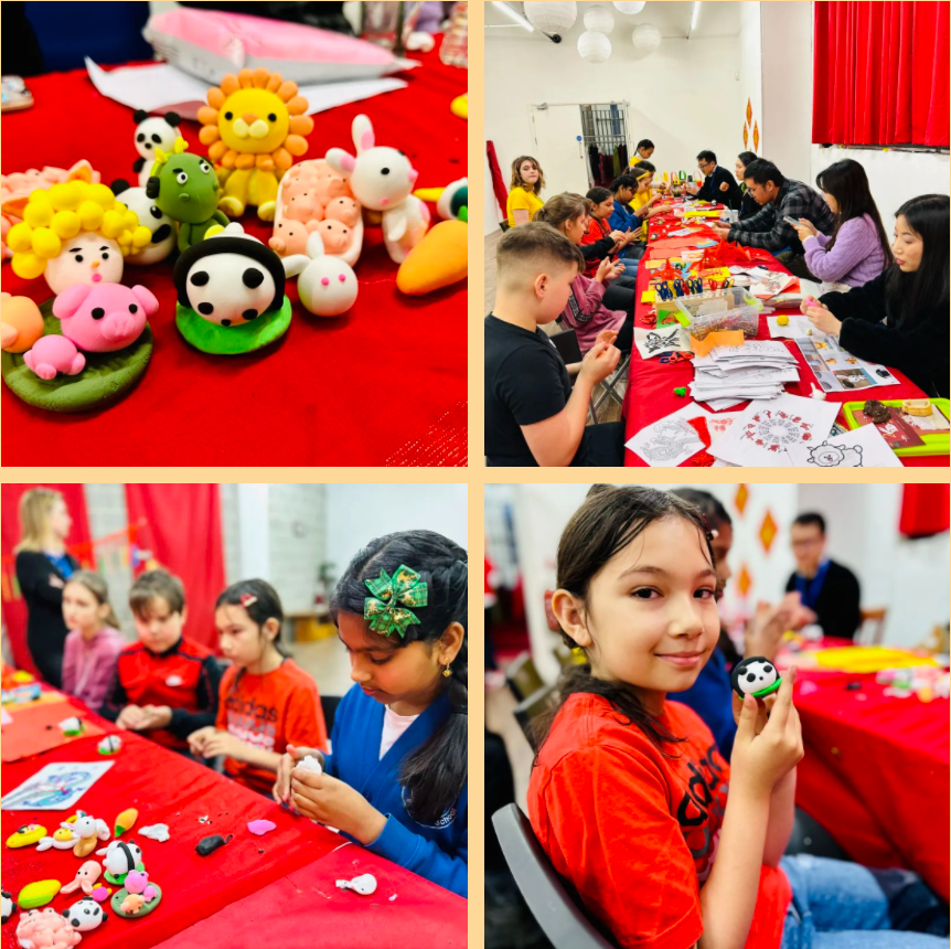 泥塑,俗称“彩塑”,是用粘土塑制成各种形象的一种中国古老的民间手工艺。出于安全与卫生考量,孔院采用了超轻粘土代替泥土为学生们带来了一场趣味十足的泥塑体验。老师们准备了各种颜色的粘土,并在桌上展示了很多制作成品供访客参考。在老师手把手的教授下,一只只可爱的小动物出现在孩子们的手中,有的小朋友做了老鼠,有的做了兔子,但是最受孩子们欢迎的当属中国的国宝大熊猫了,有的孩子还充分发挥想象力,在熊猫的底座制作了木头、熊猫的嘴边加上了竹子。泥塑是最受孩子们欢迎的项目,每个孩子都很享受泥塑制作的过程。