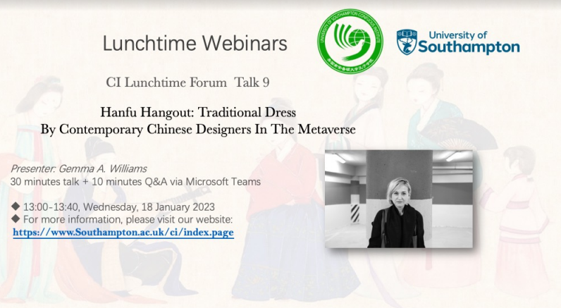 当地时间2023年1月18日午间,南安普顿大学孔子学院举办了今年第一场午间学术讲座。本场讲座题为《汉服展览:元宇宙中当代中国设计师的传统服饰设计》(Hanfu Hangout: Traditional Dress By Contemporary Chinese Designers In The Metaverse),这也是孔院资助项目的研究成果。主讲嘉宾为杰玛•威廉姆斯女士 (Gemma A. Williams)。本场讲座在Microsoft teams平台举行,由孔院核心教师傅瑛老师主持。