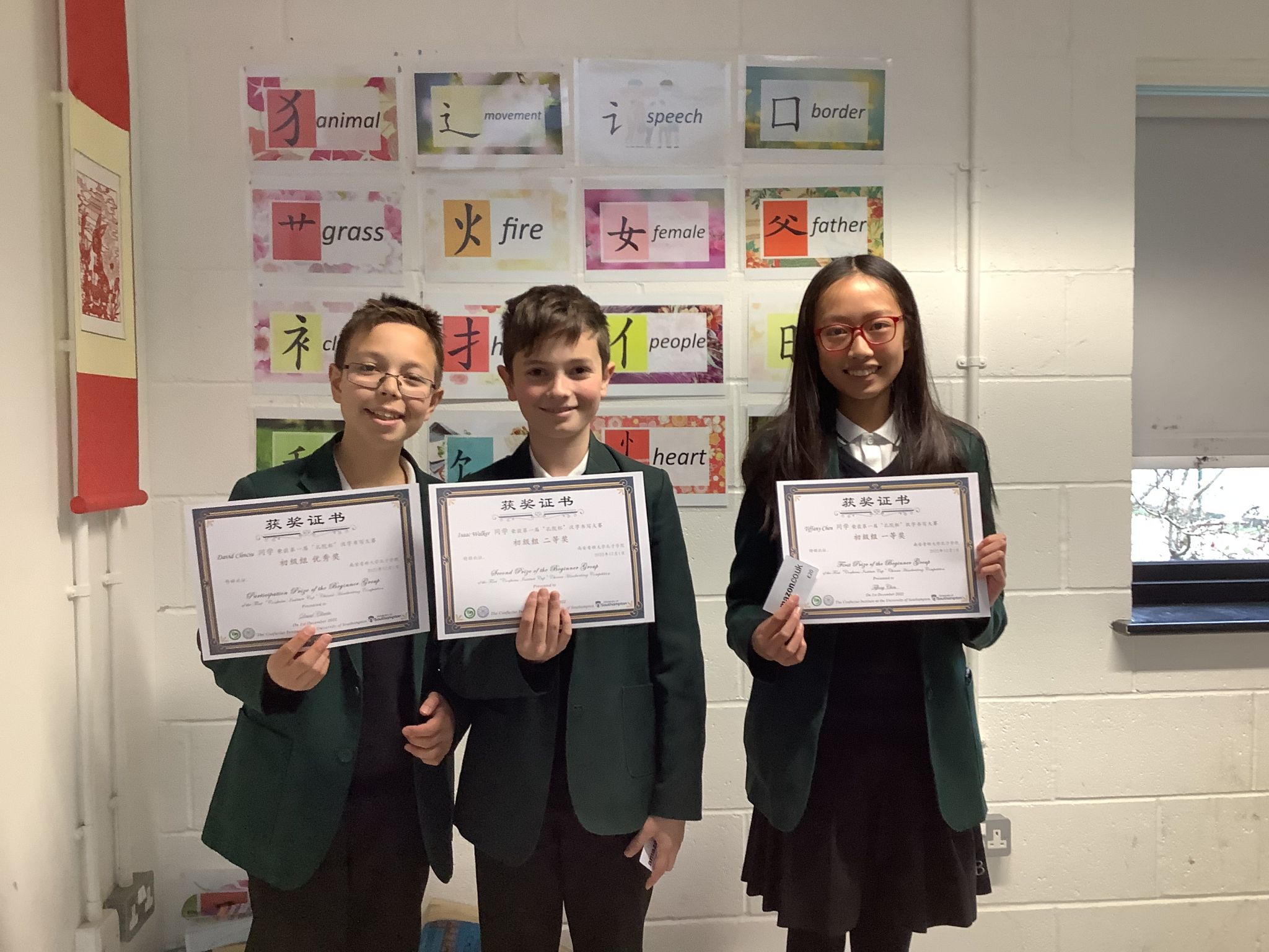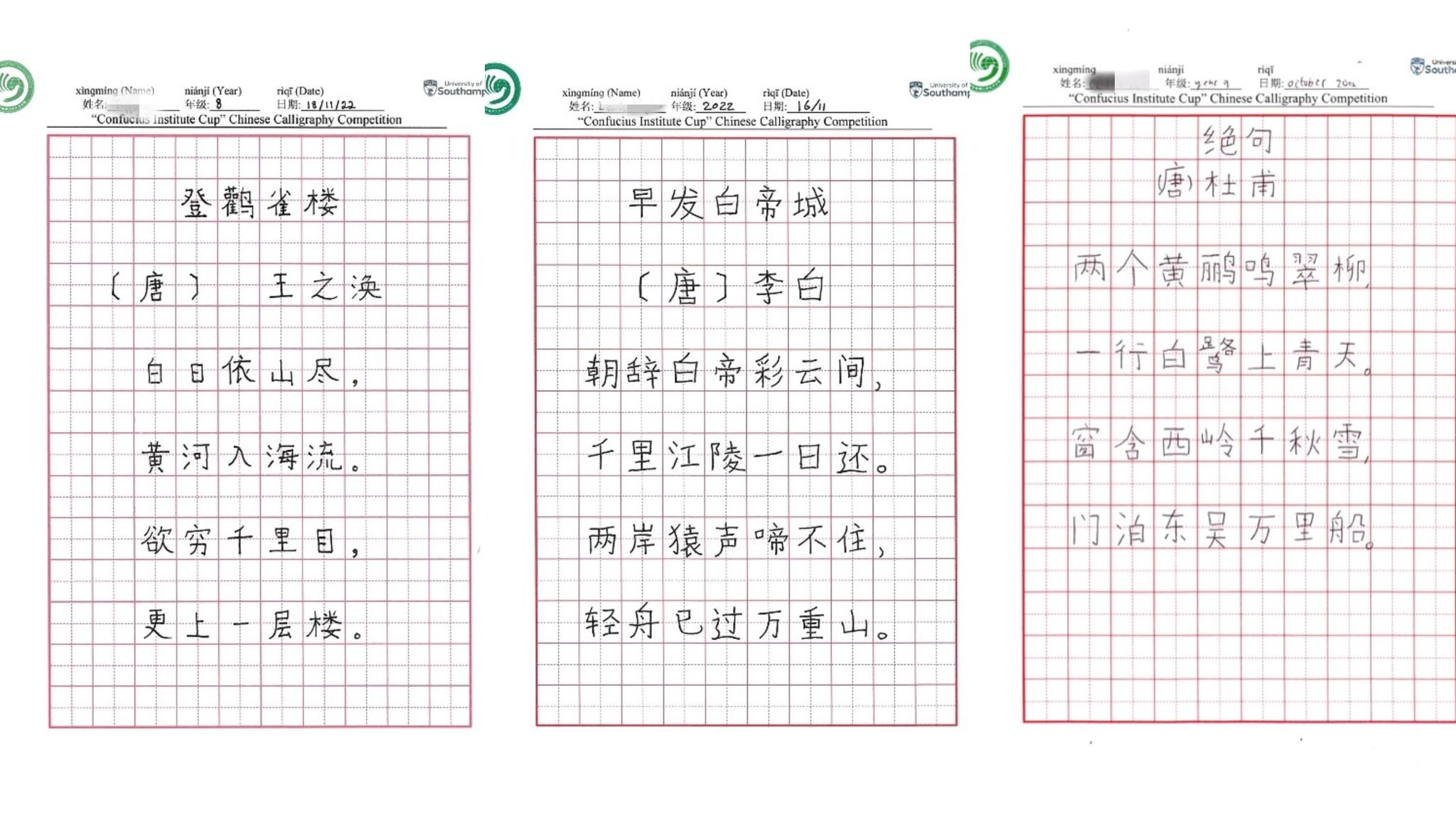 本次比赛于当地时间2022年10月初发出通知后,南安孔院下设各孔子课堂、教学点学生踊跃报名、积极准备。到作品提交截止时,共收到将近50份参赛作品。比赛流程为每位选手抄写各自级别的一首古诗,由四位没有学生参赛的孔院老师担任评委,对每份作品进行评分,最后取平均分为各选手的最终成绩。最后来自博航特利普胡克(Liphook)校区的Tiffany Chen和Lewis Naylor分别获得初级和高级的一等奖,来自博航特沃辛(Worthing)校区的Charlie Heath获得中级组的一等奖。由于本次比赛初级选手较多,故奖项根据总分和各级别人数进行了适当调整,共设置初、中、高级一等奖各1名;初、高级二等奖各2名;初、中、高级三等分别为5名、2名、1名。