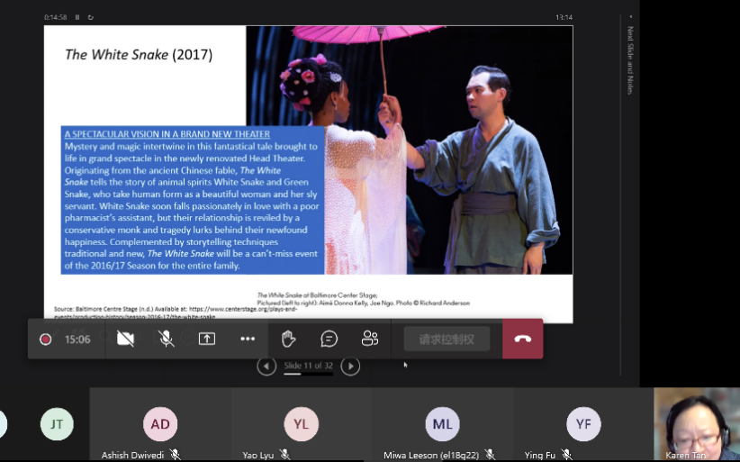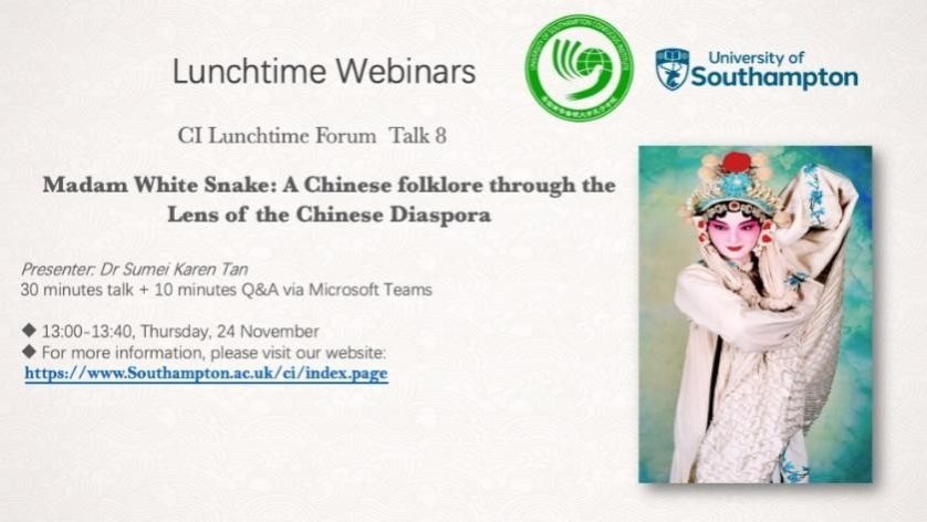 当地时间2022年11月24日中午,南安普顿大学孔子学院举办了今年第八场午间线上学术讲座。本场讲座题目为《白蛇传:华裔视角下的中国民间传说故事》(Madam White Snake: A Chinese folklore through the Lens of the Chinese Diaspora),主讲嘉宾为南安普顿大学温彻斯特艺术学院(Winchester School of Art)的 Sumei Karen Tan博士。本场讲座在Microsoft Teams上进行,由孔院核心教师傅瑛老师主持。