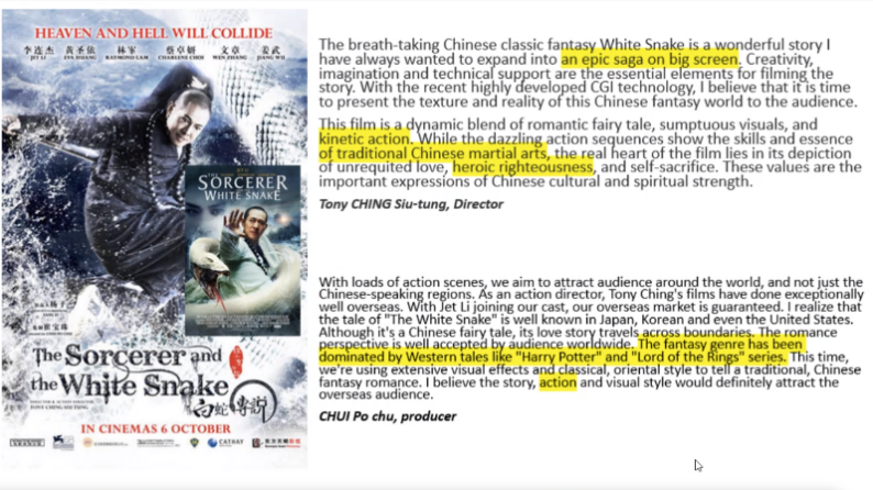在讲座的第三部分,Tan博士表示不同版本的《白蛇传》给观众传达的重点也不一样。有的想向观众展示浪漫的爱情情节,有的侧重于展现精彩的打斗场面,有的则侧重于表现不同的人物角色。Tan博士还具体分析了造成这些差异的原因,例如,有的版本旨在表达不同制度之间的斗争,而有的版本则想表达现有的局限需要外部因素的介入来加以突破。