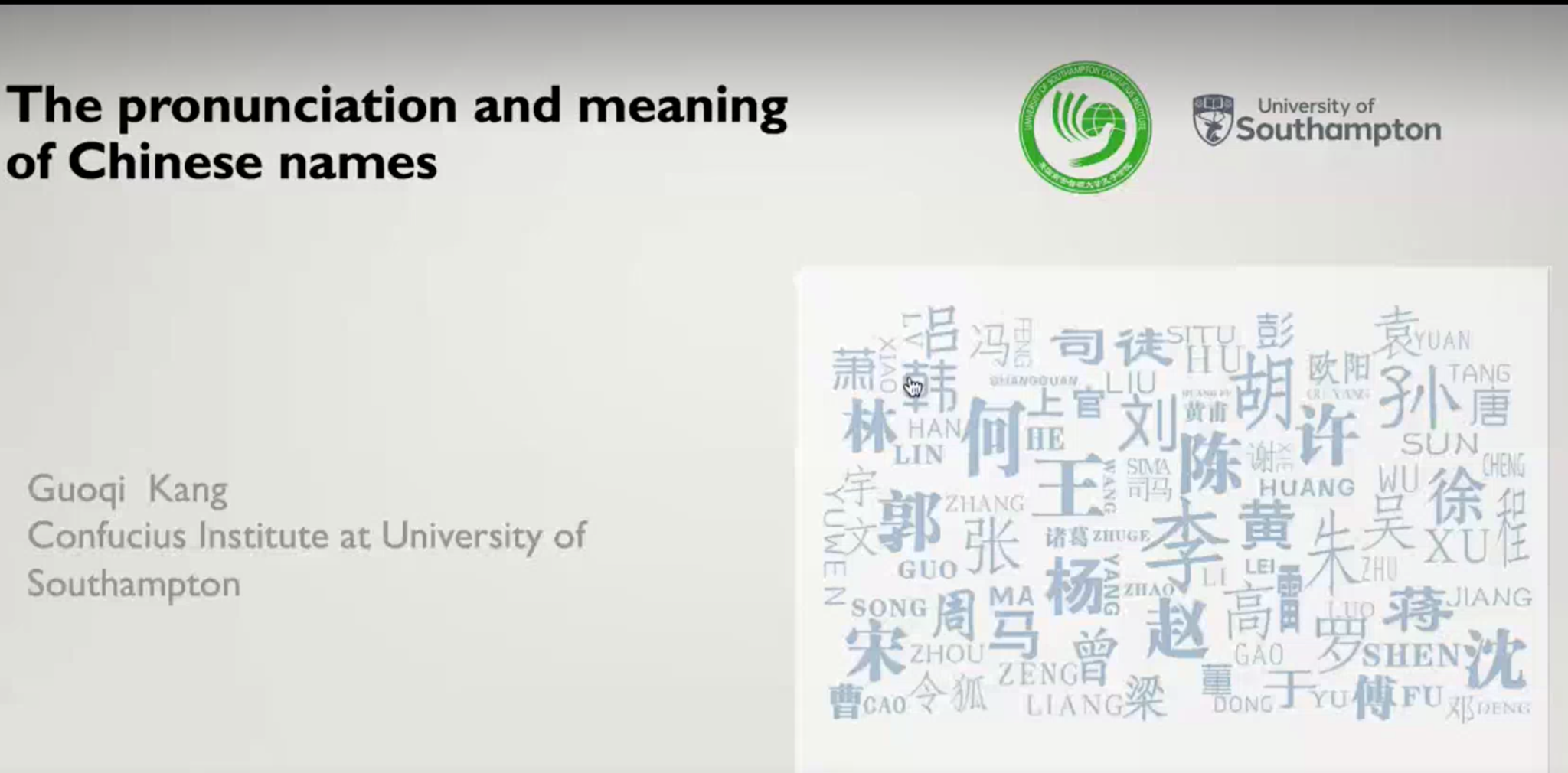 中国人的名字既是家族血脉传承的符号,表达了父母的愿望,承载着长辈的期许,也是中国人理想志向、审美情趣、信仰观念的具体化,是中国人利用汉字形、音、义的韵味传承中华文化的独特方式。近年来随着南安普顿大学中国留学生的增多,很多老师都希望能准确地叫出中国学生的名字并了解其背后的含义,借此来表达对中国文化的兴趣,并希望中国留学生能得到更多重视和人文关怀。讲座开始前很多老师都发邮件表达了不能在线参与的遗憾,南安孔院计划在明年一月再次开展相关讲座,以满足全校教师的需求,并将讲座从线上移至线下,以提高讲座的互动性。