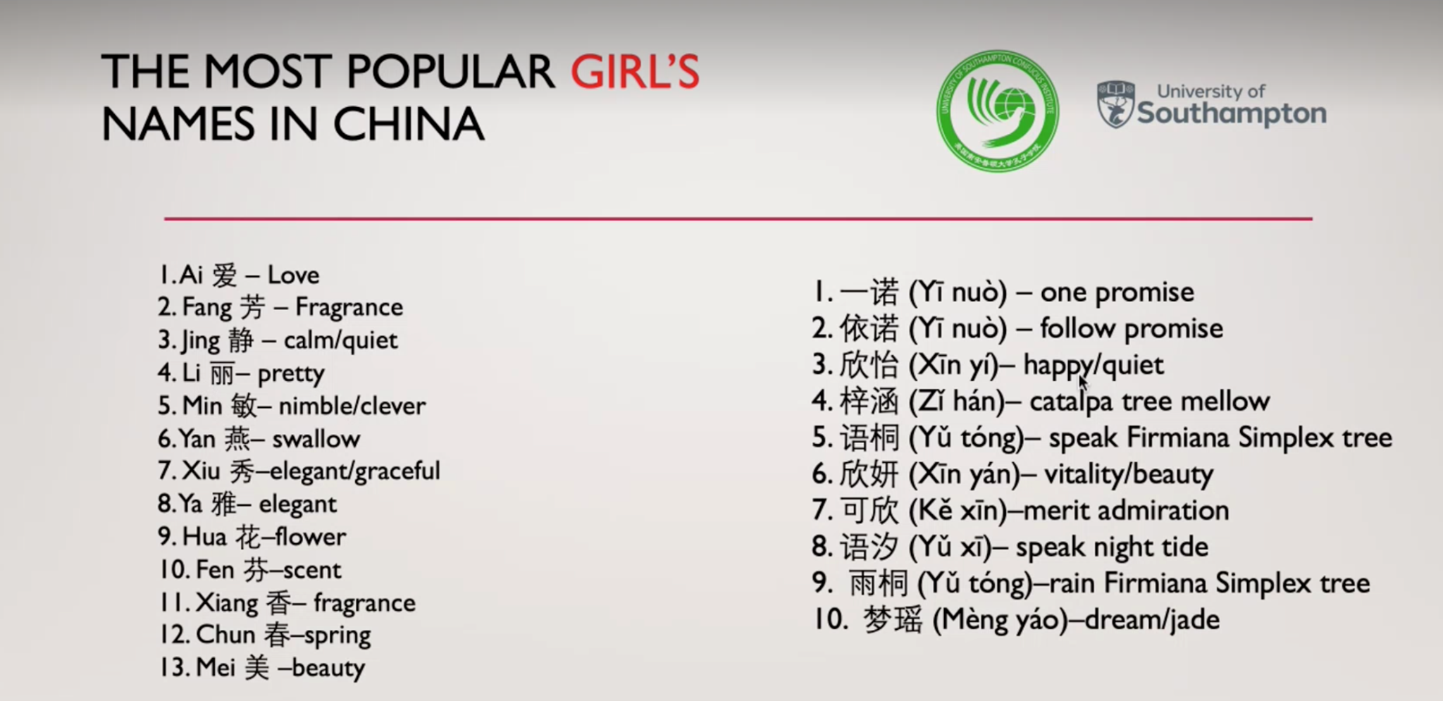 接下来康老师通过中英文名字的对比,介绍了汉语和英语姓和名位置的不同,中国女性婚后姓不随丈夫改变,以及中文名字代表了父母的愿望和审美情趣、有着多重特殊的意义三个方面内容。此外,他还介绍了中文里最常见的姓氏以及最受欢迎的男生、女生的名字等相关知识。
