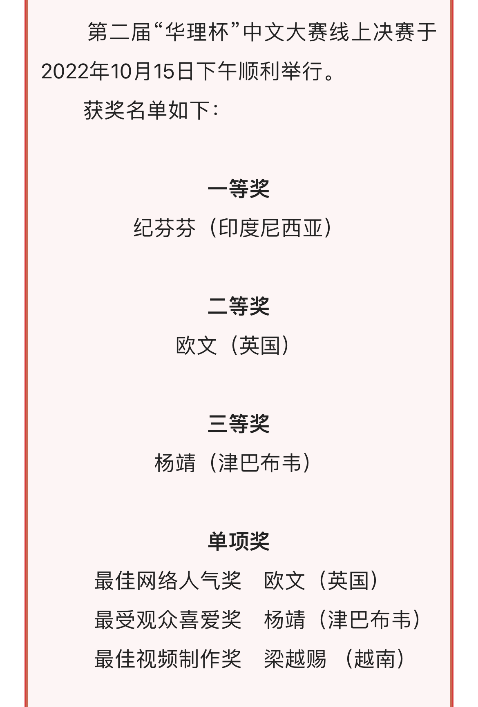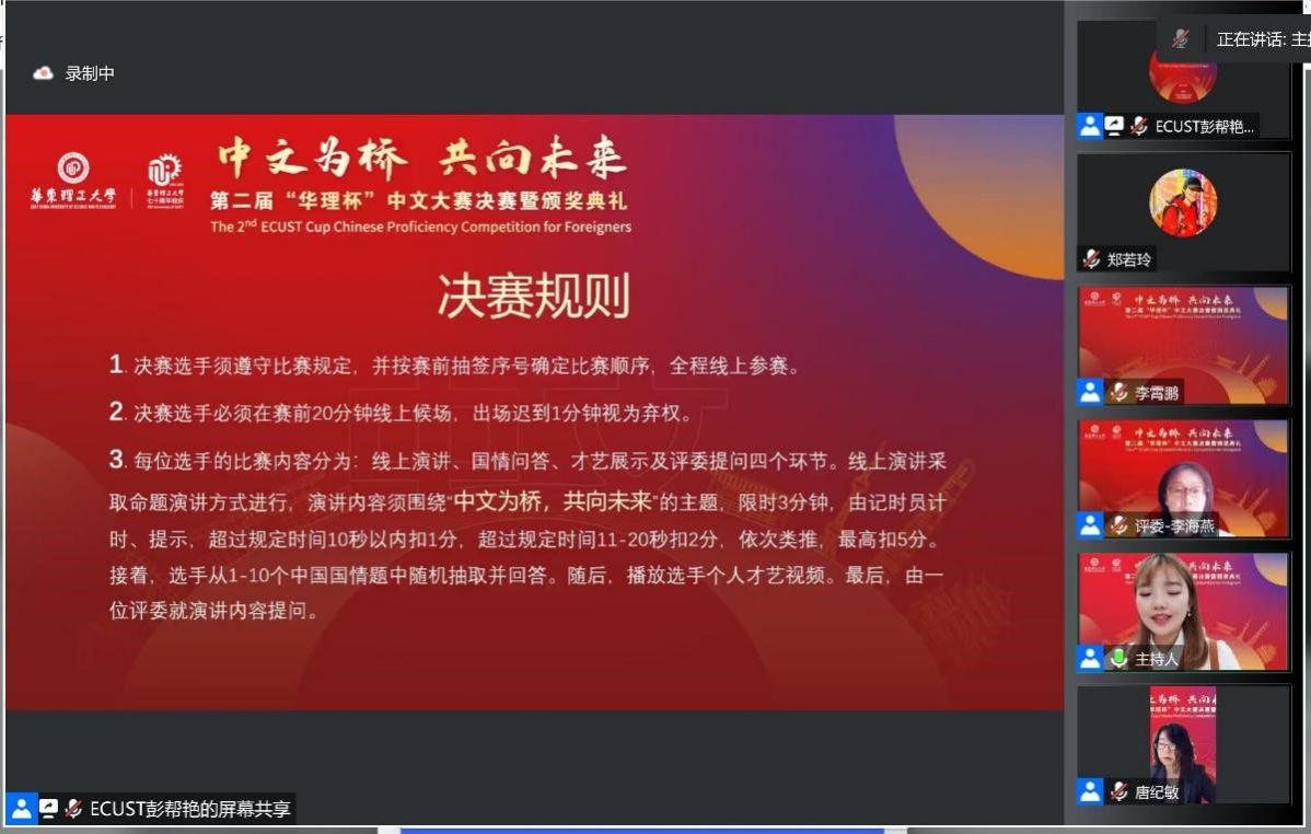 本届比赛主题为“中文为桥,共向未来”。决赛分为线上演讲、中国国情知识问答、才艺展示和评委提问四个环节。比赛中选手们都从容不迫,各展才能,呈现了一场精彩绝伦的比赛盛宴。