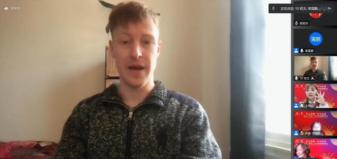 2022年10月15日,“中文为桥,共向未来”——第二届“华理杯”中文大赛决赛圆满落幕。本届决赛通过腾讯会议线上直播,吸引了许多观众前来观赛。我院学员欧文(Owen May-Jones)在本场比赛中以出色的表现最终斩获二等奖和最佳网络人气奖双奖。