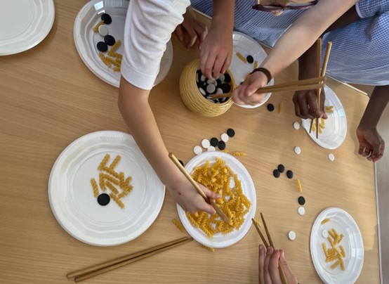 康国旗老师首先给小朋友们展示如何使用筷子,然后让他们用筷子夹通心粉和围棋。尽管大多数孩子是第一次使用筷子,但他们学习的劲头很足,努力尝试使用筷子夹起物品。经过一段时间的练习后,孩子们骄傲地向老师展示自己已经能够使用筷子夹起物品。