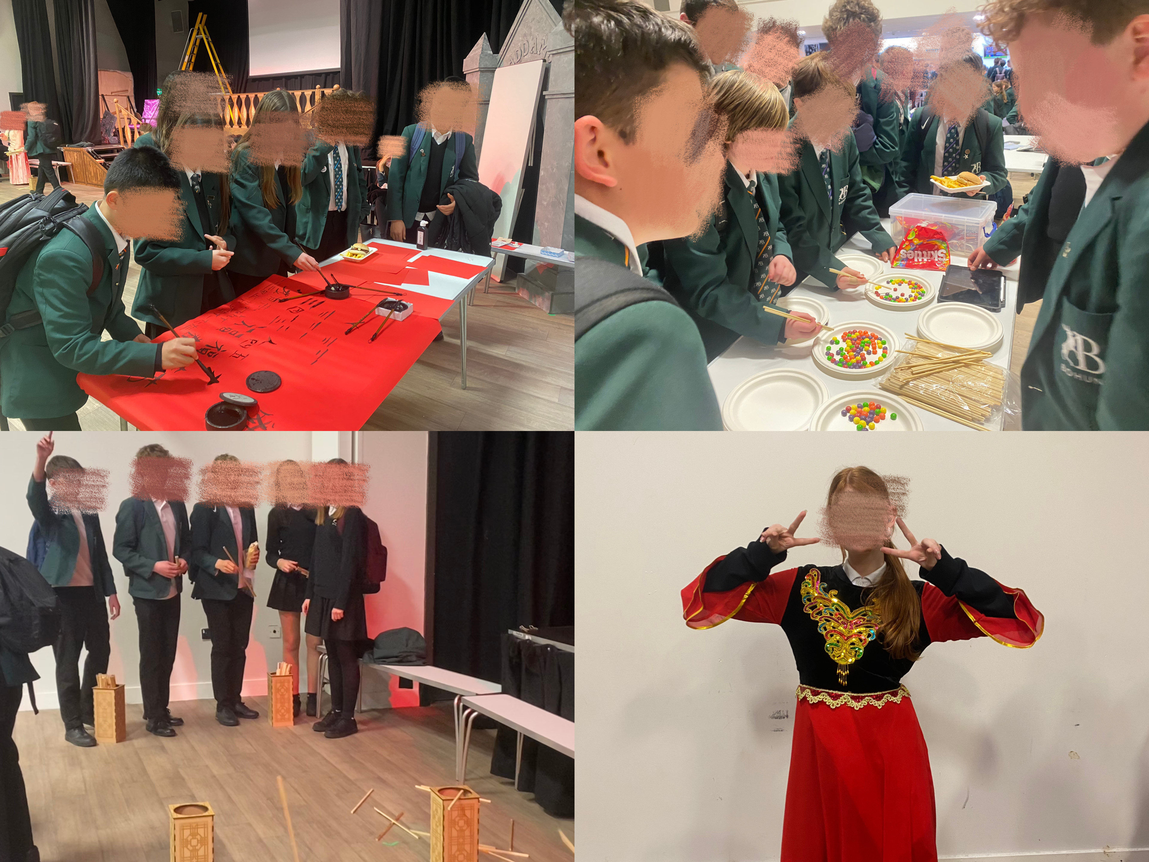 在为期一周的春节庆祝活动中,博航特沃辛中学开展了别开生面的文化活动。学生们可以用中文向老师拜年收红包,也能在午休时间参与有趣的文化活动。今年中文部一共安排了四个文化工作坊,分别是书法、筷子挑战、投壶和传统服饰秀。全校师生积极参与其中,不仅体验了用毛笔写字,还学着用筷子夹糖。其中,投壶工作坊深受男孩子的喜爱,他们争先恐后比赛投壶,展现自己的高超技术,感受了一番中国传统游戏的乐趣。在传统服饰秀的工作坊,学生们精心挑选自己喜欢的传统服饰,穿着美丽的新衣留下了一张张独一无二的照片。