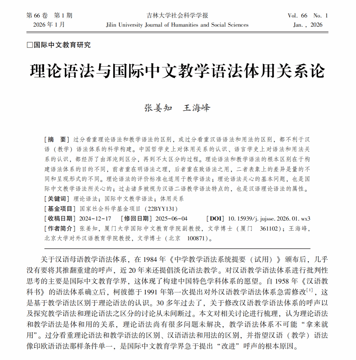 A co-authored article by Dr. Zhang Jiangzhi (Confucius Institute, University of Southampton) and Professor Wang Haifeng (Peking University), titled “On the Substance–Function Relationship between Theoretical Grammar and Grammar for Teaching Chinese as an International Language,” was published in January 2026 in the CSSCI-indexed JILIN UNIVERSITY JOURNAL OF HUMANITIES AND SOCIAL SCIENCES. The study applies the Chinese philosophical concept of ti–yong to grammar research, arguing that theoretical grammar provides the foundation for teaching grammar. An earlier version of this paper was presented at the 2024 International Annual Conference of the British Chinese Language Teaching Association, hosted by the Confucius Institute at Newcastle University. The article offers a unified framework for grammar teaching, curriculum design, and teaching-material development in international Chinese education.