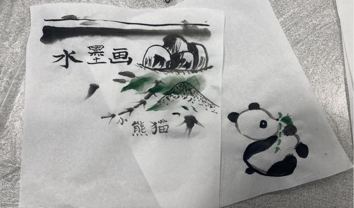 本次工作坊,以“探索中国画”为主题的国画工作坊由陈婉秀老师首先带领同学了解了与中国画相关的文化知识,比如大熊猫是中国的国宝,寓意着平安、富贵;“熊猫抱竹”寓意象征着步步高升,翡翠竹节一节比一节高。再介绍了中国画的分类和工具,用深入浅出的语言与生动美观的图片带领同学们走进中国画探索之旅,使同学们既领略到中国传统水墨画的独特审美特质,又掌握一些实用技巧。大部分学生是第一次使用毛笔和宣纸,他们感到非常新奇有趣的同时,也觉得独立完成一幅熊猫水墨画极具挑战性。陈婉秀耐心地给学生示范如如何正确握笔,调节墨的浓淡等。由于学生年龄普遍偏小,注意力很难长期集中。对此,陈婉秀还精心设计了课件,比如“分步骤”讲解,在老师的带领下,学生们一步步模仿,先在练习纸上完成尝试,对毛笔和构图的掌控更加熟练后,再在宣纸上创作。