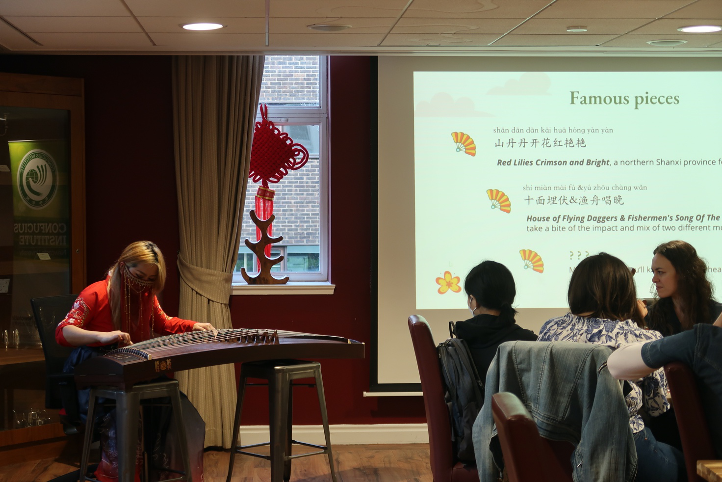 接下来,周瑶老师给大家介绍了端午节的由来和习俗。一句“亦余心之所向兮,虽九死其犹未悔”讲尽了屈原心忧家国、情牵百姓的精神,也讲出了端午节成为中国重要传统节日的缘由。随后,大家一起了解了古筝的基本知识,并欣赏了精彩的古筝表演。秦筝吐绝调,玉柱扬清曲。古色古香的传统服饰和悦耳动人的乐声让大家沉醉其中。随后,师生们一边享用美食小吃,一边参加文化工坊、学习古筝弹奏。活动在学生们的依依不舍中结束。