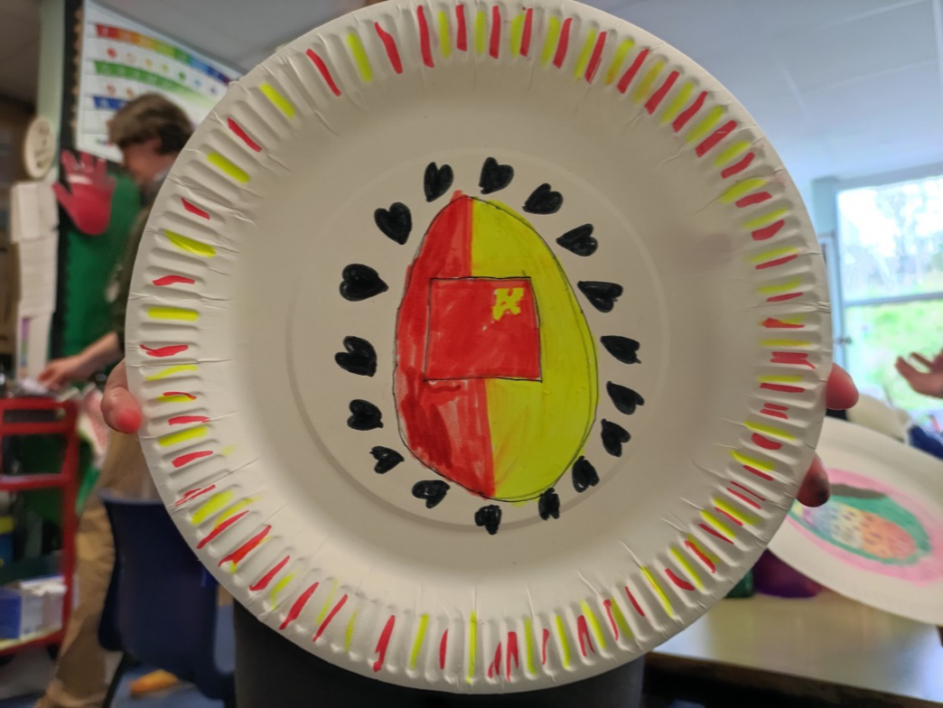 随后,谈老师给学生们分发了一次性餐盘,让孩子们充分发挥自己的想象力,在盘子上做出自己的“个性彩蛋”。小朋友们艺术细胞极为丰富,他们尽情挥洒想象力,在一个个盘子上创造出了各种各样、五颜六色、生动有趣的彩蛋。有的小朋友做了“万圣节” 暗黑风格的“魔鬼”彩蛋;喜欢喝珍珠奶茶的小朋友则展示了自己的“红糖珍奶”彩蛋,让人看了也想要点一杯;有的非常热爱中国文化,特意在自己的彩蛋上画了五星红旗。谈老师感动之余也不忘开玩笑说,这很像中国的家常菜“番茄炒蛋”。