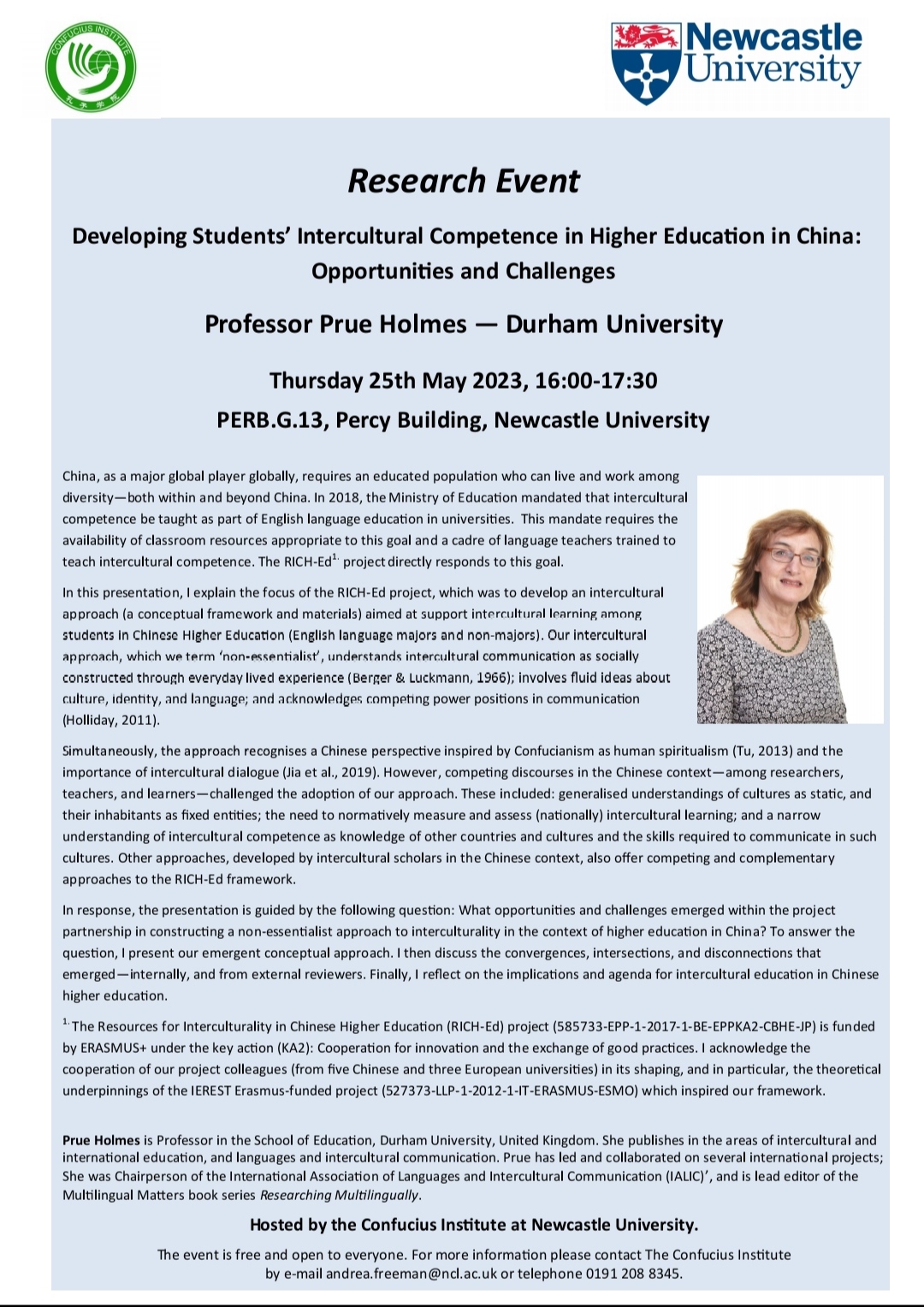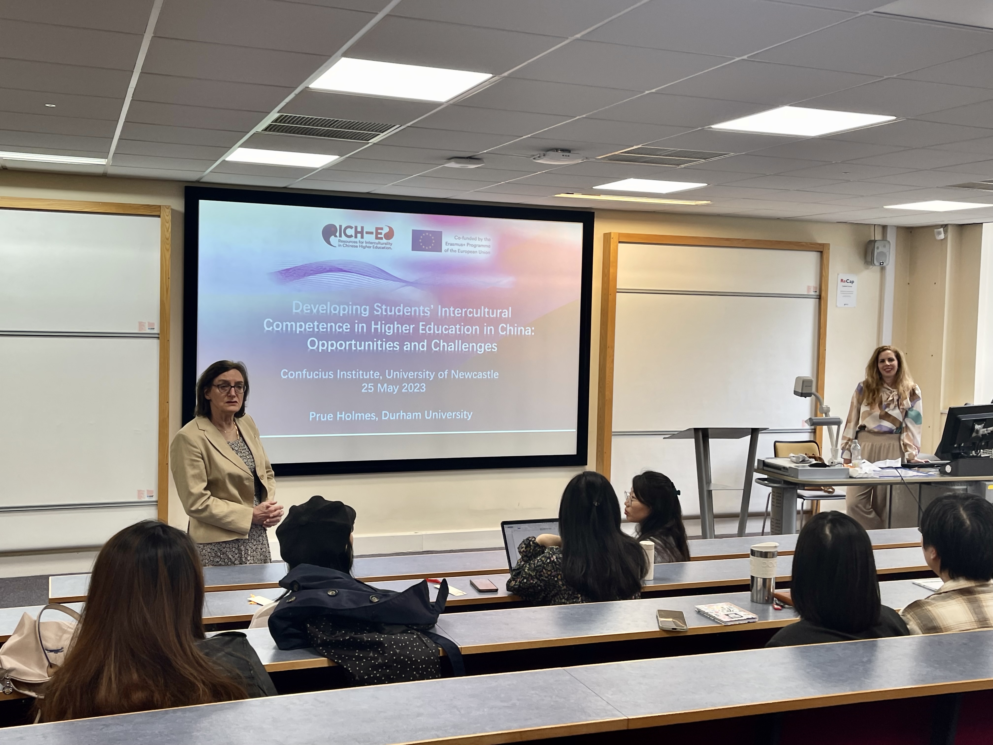 本次讲座在纽卡斯尔大学Percy Building举行,由杜伦大学教育学院的普鲁·霍姆斯(Prue Holmes)教授主讲,纽大孔院代理外方院长萨拉·加纳辛(Sara Ganassin)担任主持,与会者包括来自纽卡斯尔大学和杜伦大学的对跨文化交流感兴趣的教师和学生。