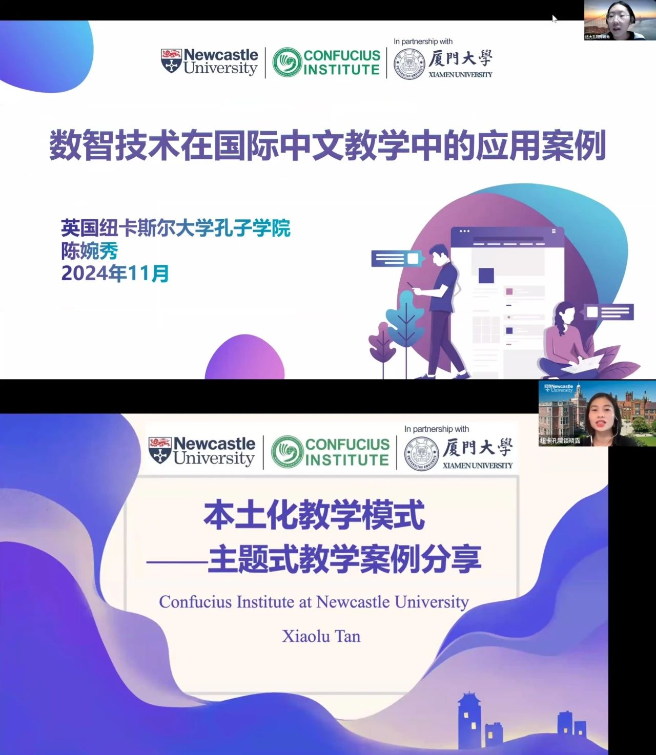 此前,陈婉秀和谈晓露两位教师还受邀在语合中心举办的2024年欧洲地区外派中文教师线上岗中培训上分享自己的教学经验。两位老师分别以《数智技术在国际中文教学中的应用案例》和《本土化教学模式——主题式教学案例分享》为主题,与各位公派教师展开交流。