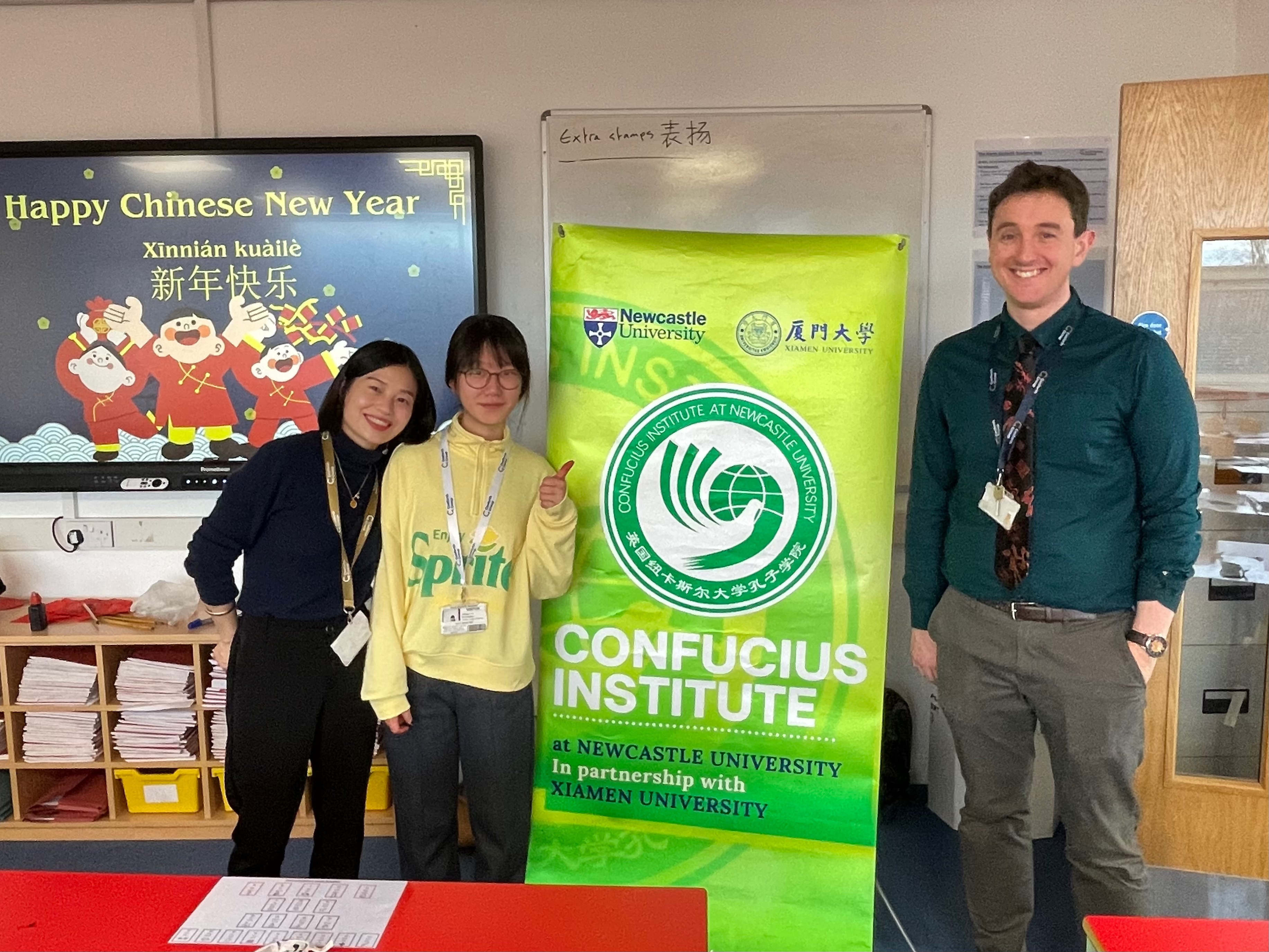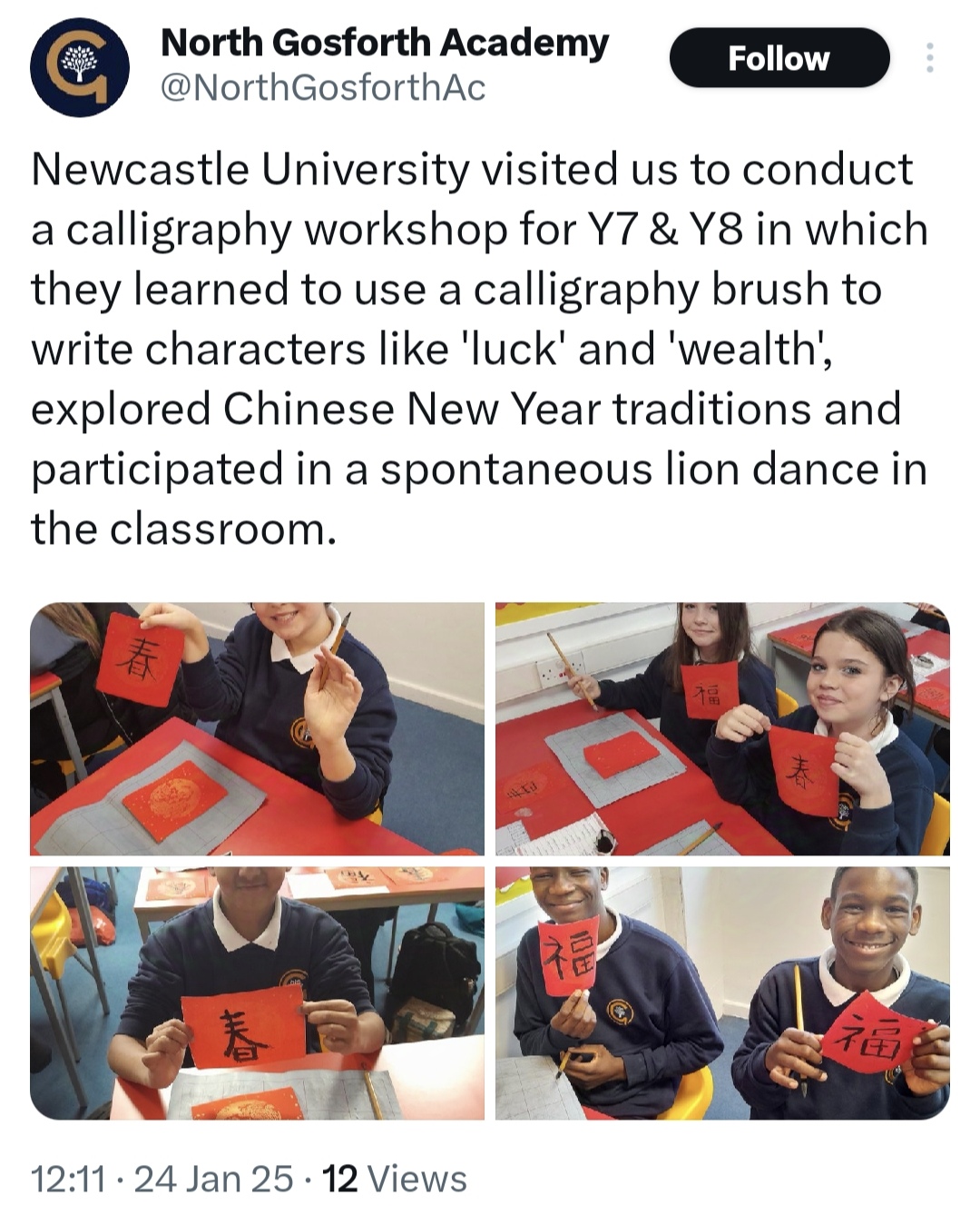 书法工作坊在North Gosforth Academy进行,七、八年级的60名学生参与其中,谈晓露老师主讲,吕佳莹老师辅助。