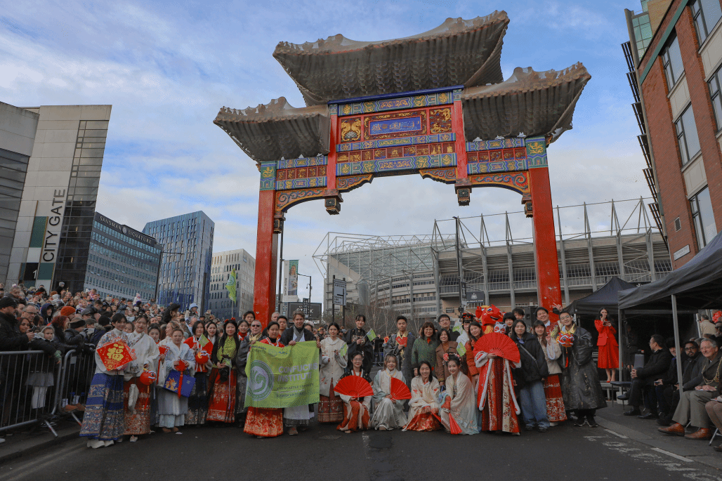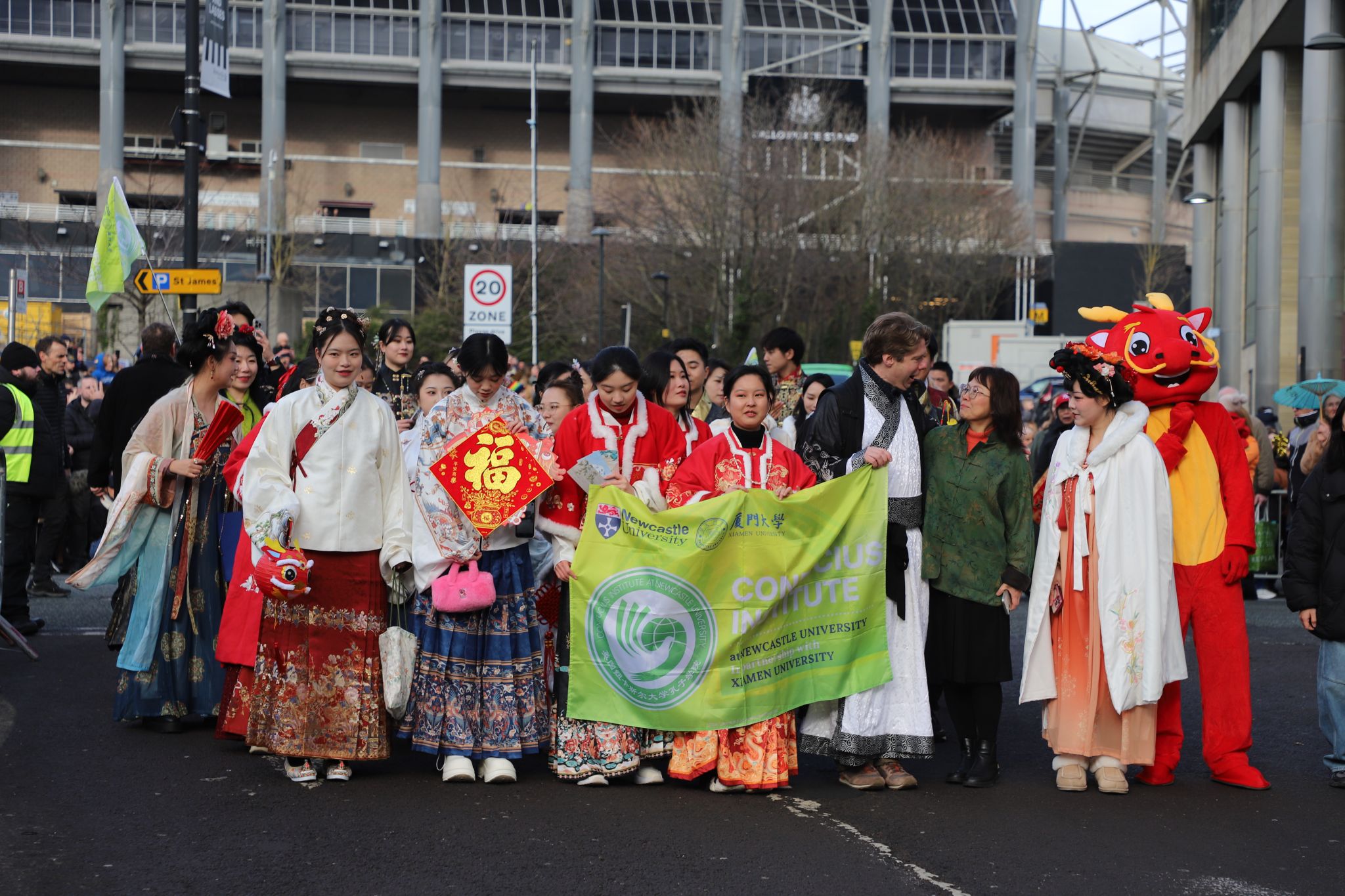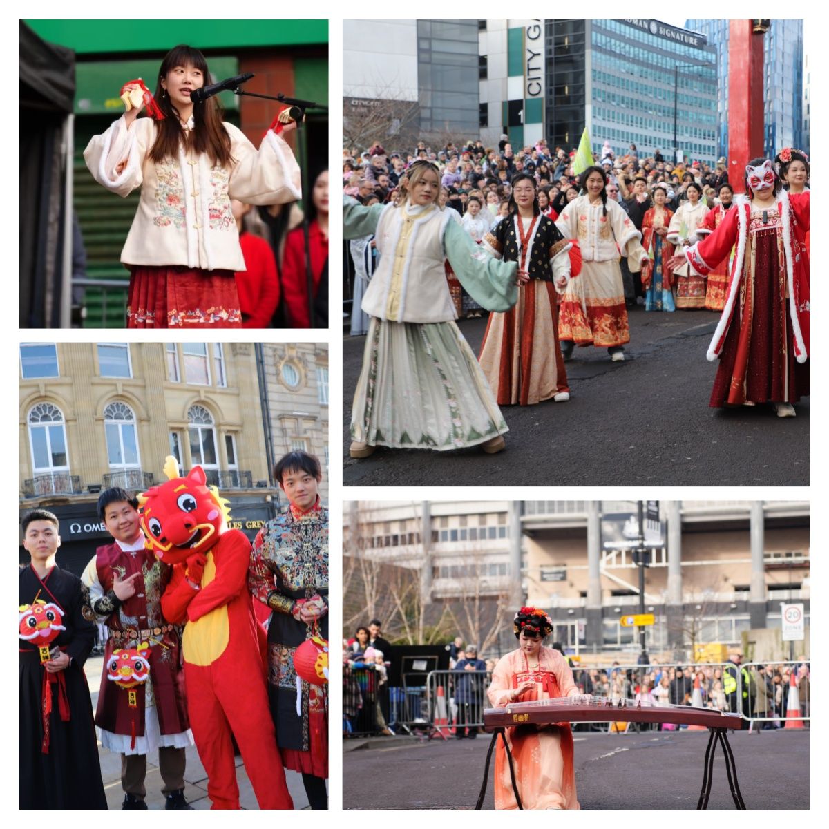 当地时间2月2日,英国纽卡斯尔大学孔子学院举办的春节汉服游行活动在纽卡斯尔城中热闹展开,本次活动由朱柳婧老师、院长苏欲晓教授主负责,岚瑾、佳莹、星怡和晓露老师共同组织,众多中国留学生与纽大孔院学员踊跃参与,为传统春节增添了浓厚的文化氛围。活动当天,数万名纽卡市民在道路两旁聚集起来,汉服、舞龙舞狮、腰鼓队……吸引了众多观众前来观看。