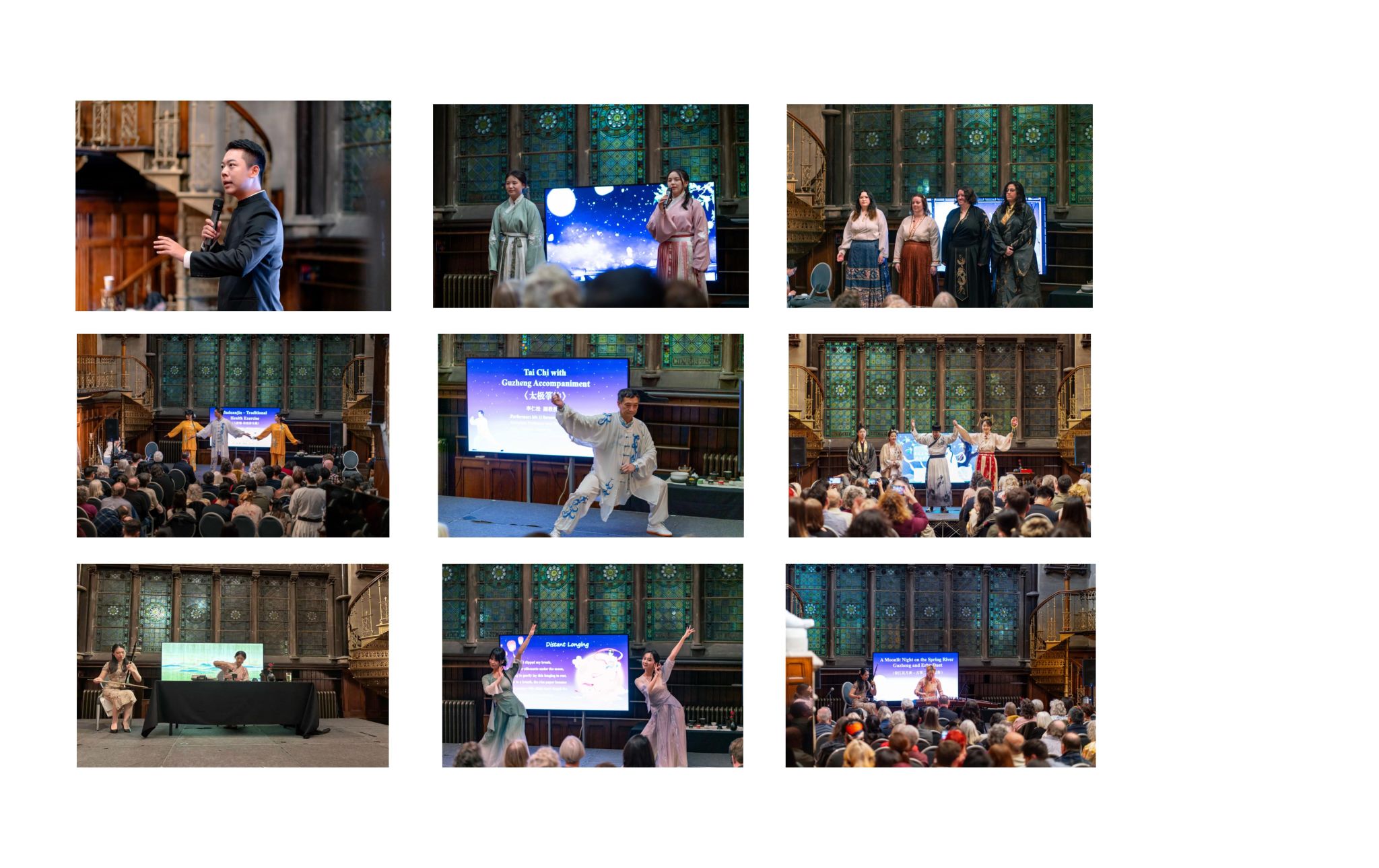 晚会现场,《嫦娥奔月》神话剧拉开了晚会的序幕。演员们通过“后羿射日”“王母赐药”“蓬蒙偷药”“嫦娥奔月”“对月互思”的五幕场景,生动传神地演绎了中秋节的神话起源,与其中的文化张力。这场由孔院老师自编、自导,由四位来自厦门大学、北京语言大学和纽卡斯尔大学的中国籍学生,以非专业的身份专业呈现的迷你神话剧,引起了现场观众的阵阵掌声。紧接着,厦门大学体育系副教授、纽大孔院的中华传统体育专任教师李仁松,带来了传统养生功法“陈式太极拳”以及“八段锦”两段表演,其动静结合,张弛有度的招式,更是引发观众连连惊叹,在全场掀起了一股高潮。随后,孔院教师朱柳婧携四名HSK的英国学生朗诵中英文李白的《静夜思》,在悠扬的诗韵中,深情演绎了月圆与乡愁。当现场观众得知,参加表演的四名学生都只学了两个学期的汉语,更是在声声赞叹中,给予了热烈的掌声。这个节目的寓意深厚,不仅向观众展示中国经典“乡愁”古诗的魅力,更是展示孔院教学工作的成果,激发和吸引更多的汉语学习者。