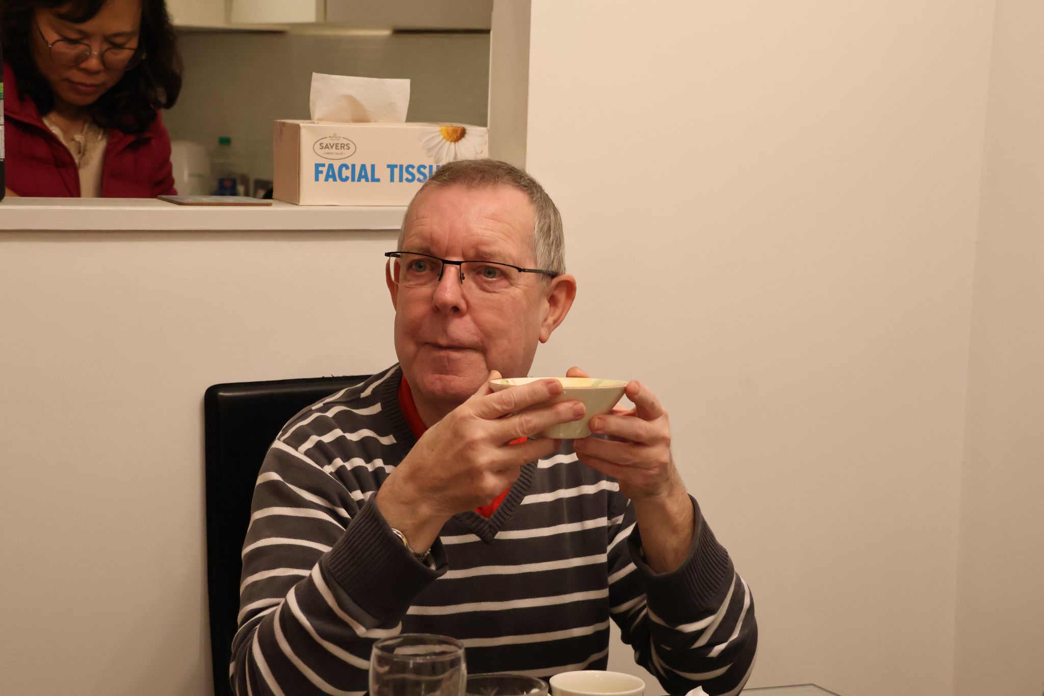 当天的聚会上,众人围坐一桌,中英文化在烟火气中自然交融。孔院教师们分享着在英教学的趣事,Bill 也深情回忆起与历任孔院老师的点滴过往。欢声笑语与餐桌上的腾腾热气交织升腾,让这场朴实的聚会满溢着跨越文化与时光的温暖。