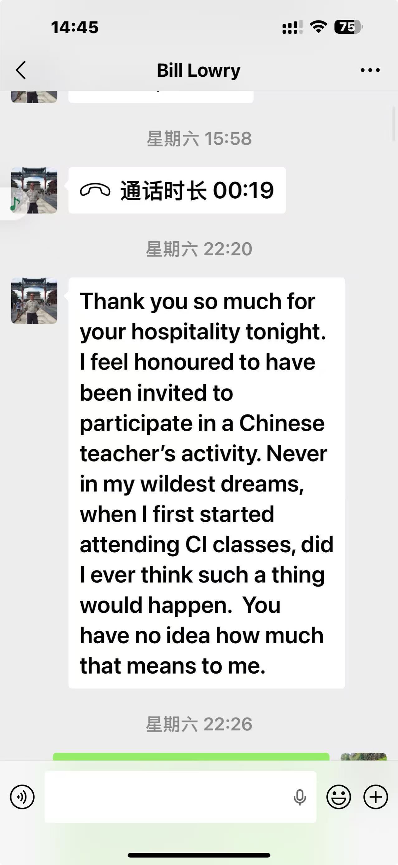 家宴结束不久,Bill返回住处后便向苏院长发来一段饱含深情的信息。他感慨道,当天与孔院全体教师如同家人般团聚的场景,是他“从未想象过的温暖时刻”。苏院长精心组织的这次聚会,使他深切感受到来自孔院团队的真挚情意。多年来,Bill 始终秉持“只愿付出、不求回报”的朴素初心,为每位抵达纽卡斯尔的孔院教师敞开家门、热情接待,这份长久而坚定的支持,在孔院师生中引发了深切共鸣与广泛感动。