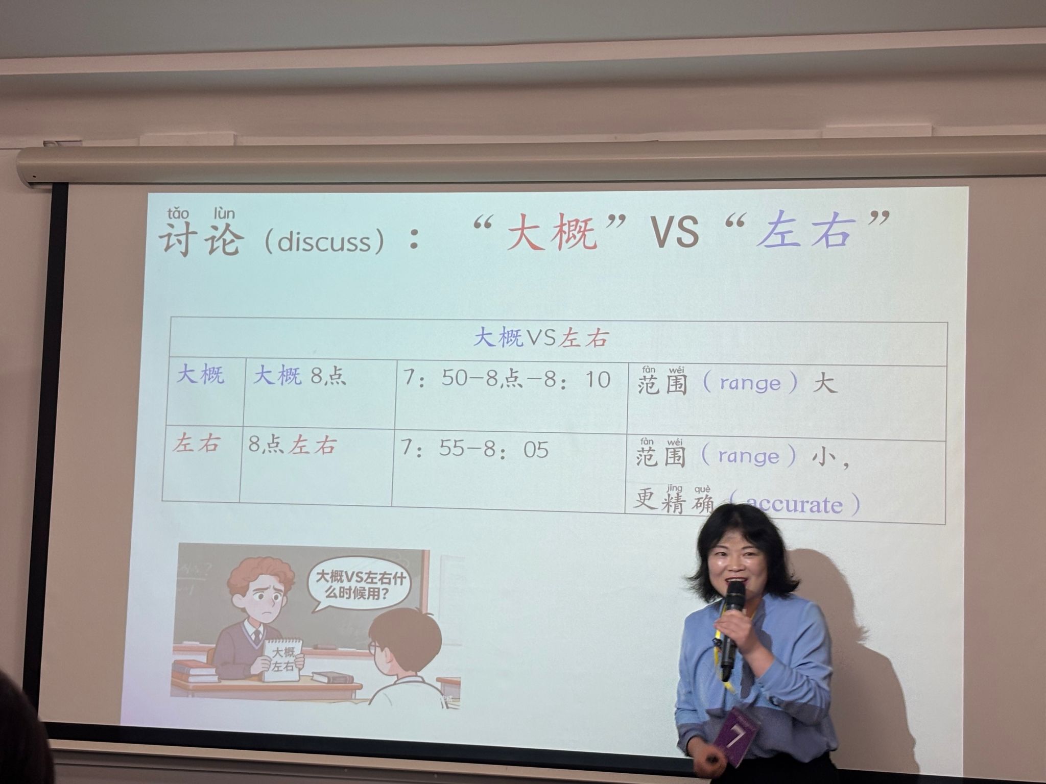 29 日率先开赛的是大学成人组比赛。王苗以《“左右”表达概数的用法》为主题开展教学展示。她在课堂设计中巧妙融入纽卡斯尔当地浓厚的足球文化,以纽卡斯尔联队相关元素引入语法点,通过真实场景模拟与实用交际任务,引导学生理解并掌握“左右”表概数的表达方式。王苗的课程精准契合当地学生兴趣,教学环节自然流畅,语言点讲解清晰透彻,课堂互动充分高效,最终成功晋级决赛。