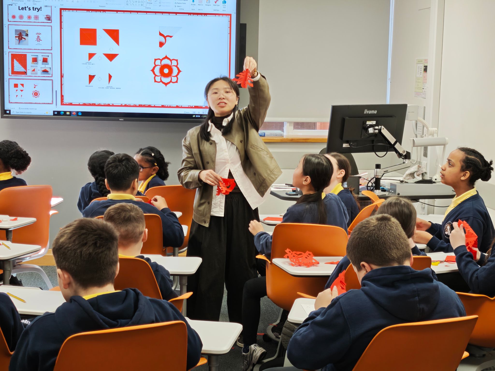 剪纸课堂则是色彩与巧思的碰撞。在王苗、朱柳婧老师的剪纸课堂中,来自Christ Church Primary 和Our Lady & St. Anne's Catholic Primary School共计60余名学生,一张张红纸在剪刀的起落间,变幻成活灵现活的窗花和带着暖风的“春”字。当学生们展开作品,看到对称的美学图案呈现在眼前时,教室内爆发出一阵阵惊喜的欢呼声。而志愿者教师吴尚童则带着来自St Michael's Catholic Primary School 30名四年级的小学生剪出了蝴蝶、春花,小草,把纽卡斯尔的春天用中国剪纸装进了白色的纸盘,孩子们看着自己的作品,欣喜万分。