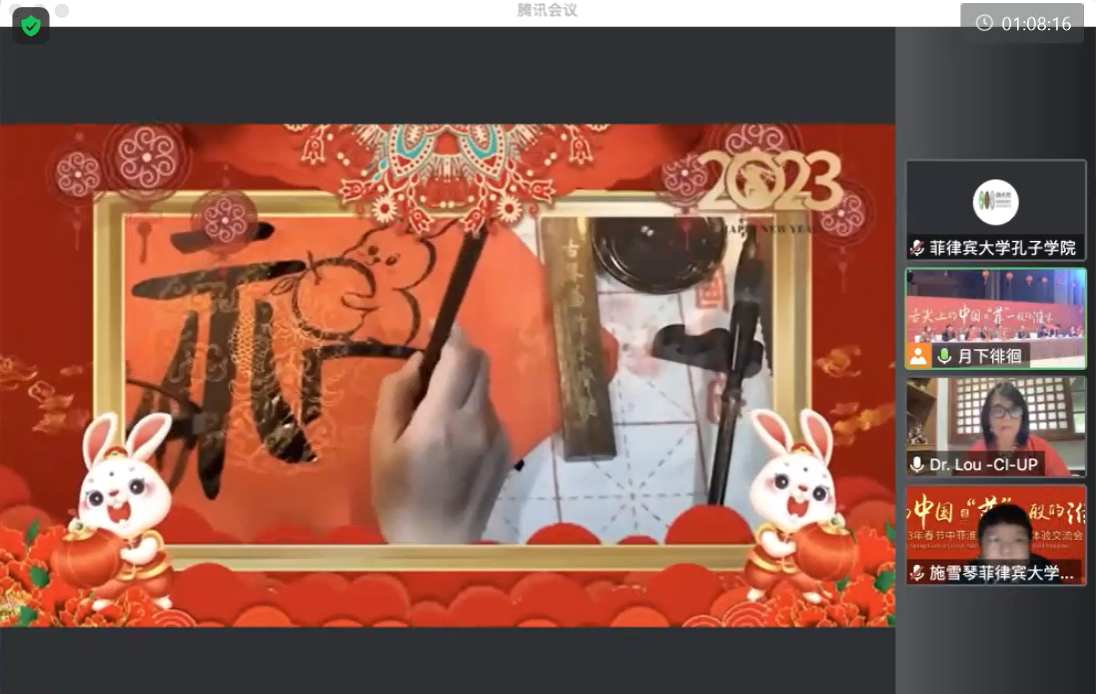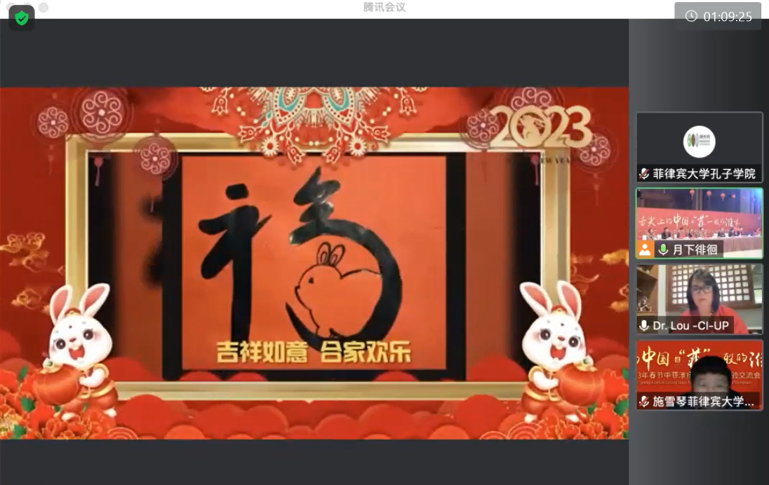 在书法展示环节,菲大孔院学生展示了不同字体的“福”字书法作品,并融入生肖兔年的春节文化元素,有的流畅端庄,有的活泼俏皮,表达了对中国福文化和生肖兔年的理解。