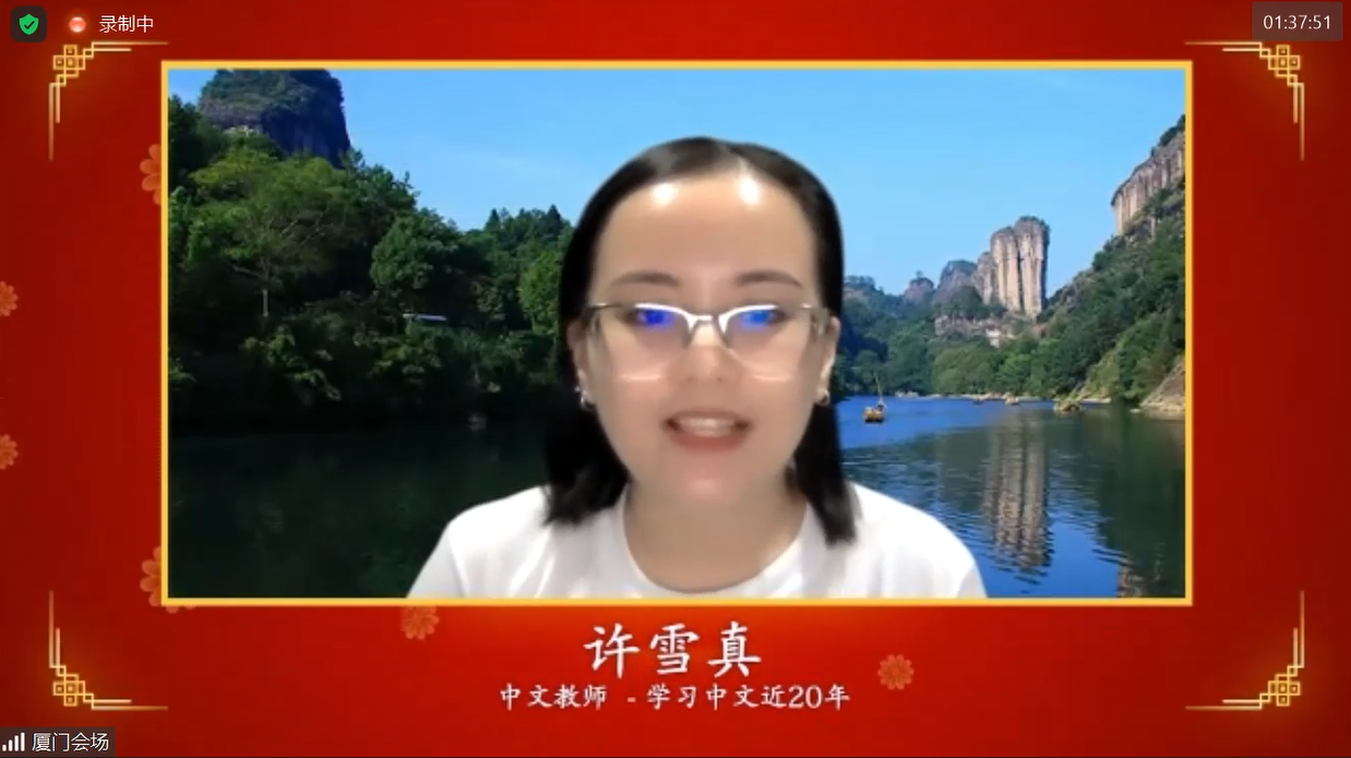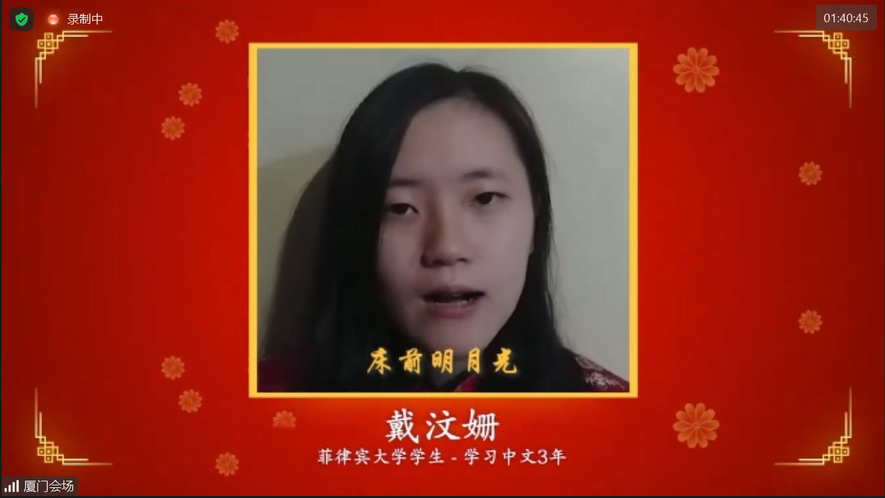 菲律宾大学孔子学院在活动中展示中文教育成果,回顾了孔院的发展历程,学员代表许雪真、安丽雯用流利的中文表达对中国文化的热爱与中菲人文交流的感想,学员们吟诵了唐诗《游子吟》、《静夜思》以及《礼运大同篇》,她们声情并茂的朗诵,充分展现了中文的音韵美、中国传统文化的意境美和中华国学典籍的底蕴美,获得了在场嘉宾的肯定和赞许。本次节目制作由驻菲使馆指导,李田智老师协助在菲大孔院组织完成。