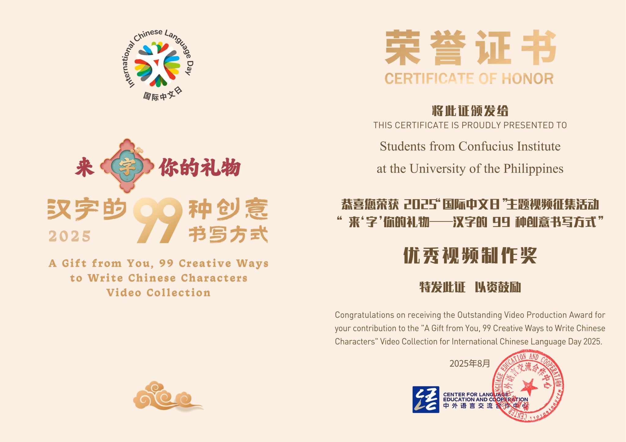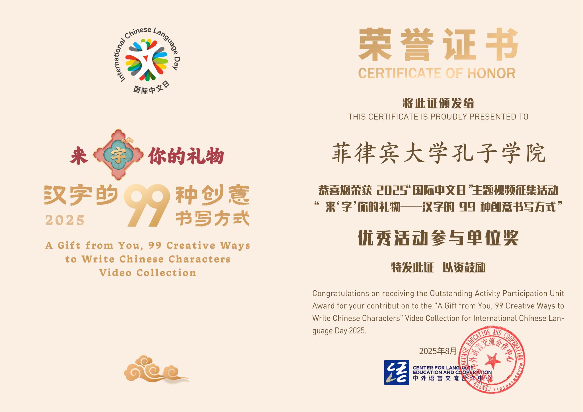 近日,菲律宾大学孔子学院收到多项喜讯——在教育部中外语言交流合作中心与中文联盟联合发起的2025年“国际中文日”主题视频征集活动中,孔院通过精心组织、优质创作和专业指导,荣获“优秀活动参与单位奖”“优秀视频制作奖”“优秀指导教师奖”三项重要荣誉,在全球中文教育与文化传播舞台上展现了中菲文化交流的坚实成果与独特魅力。
