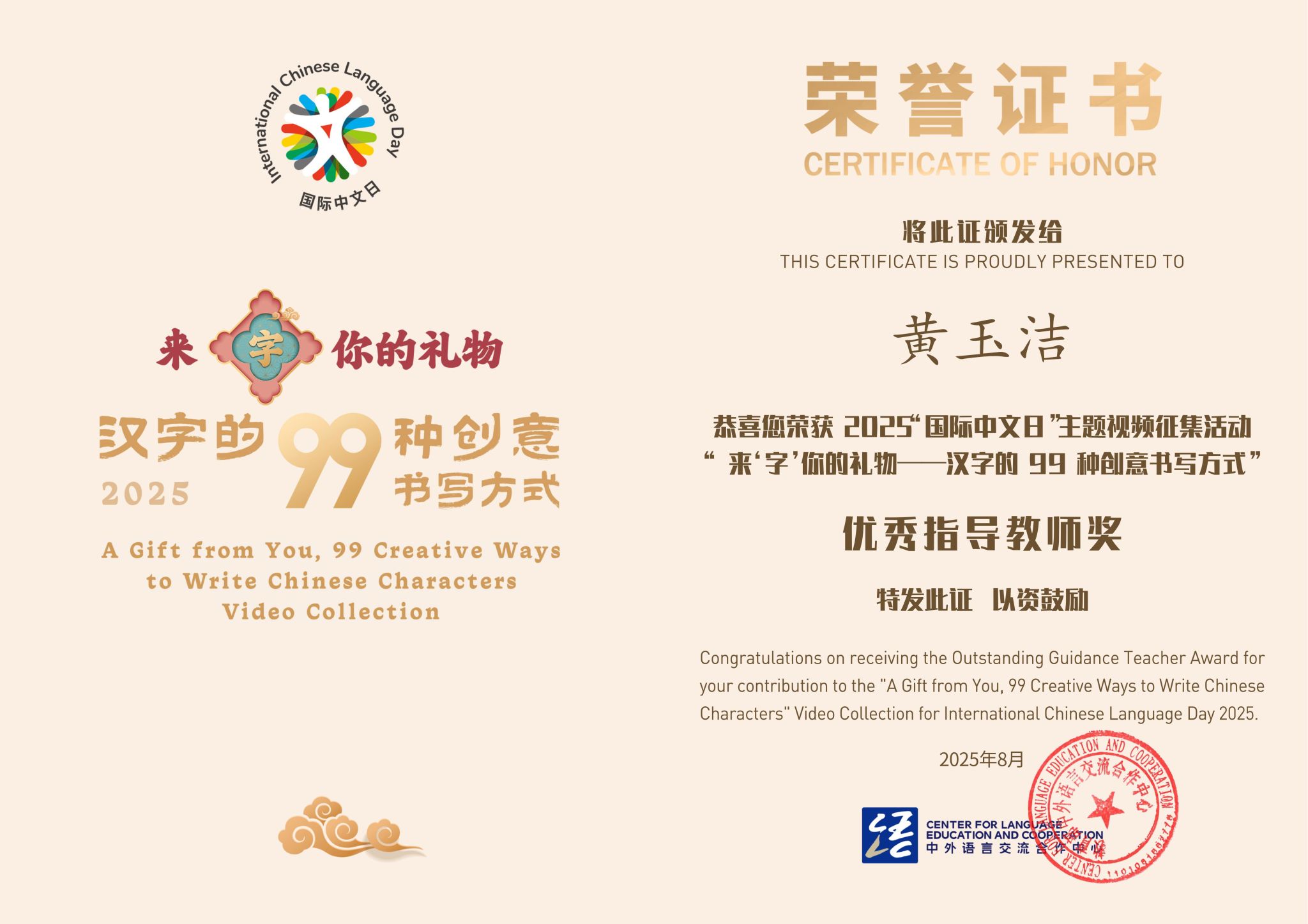 本次主题视频征集活动以“来‘字’你的礼物——汉字的99种创意书写方式”为主题,鼓励各国中文学习者和教育者用当代创意激活传承千年的汉字基因。活动启动后,菲大孔院高度重视,广泛动员师生参与创作。孔院报送的视频作品紧扣主题,既展现了中文学习的鲜活场景,也融入了中菲文化融合的独特视角。其中,视频作品《甲骨文体操》将古老的甲骨文以动态的肢体动作展示出来,兼具文化内涵和观赏性,凭借新颖的呈现形式斩获“优秀视频制作奖”。孔院荣获“优秀活动参与单位奖”,彰显在活动组织中的高效统筹能力。此次孔院累计征集作品数量与质量均居前列,充分调动了孔院学生参与中文文化活动的热情。同时,孔院教师黄玉洁以专业、耐心的指导,指导学员挖掘创作灵感、提升作品质量,荣获“优秀指导教师奖”。