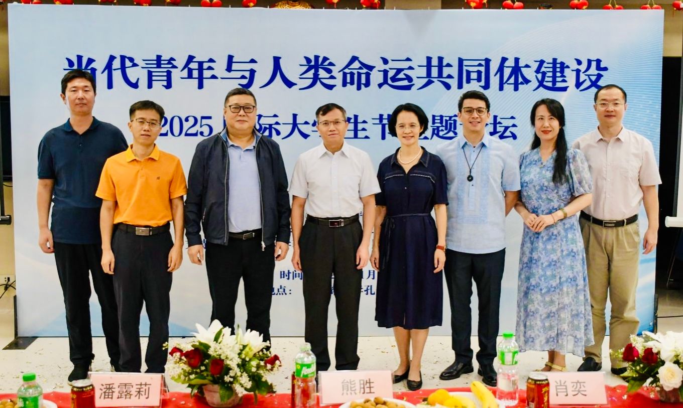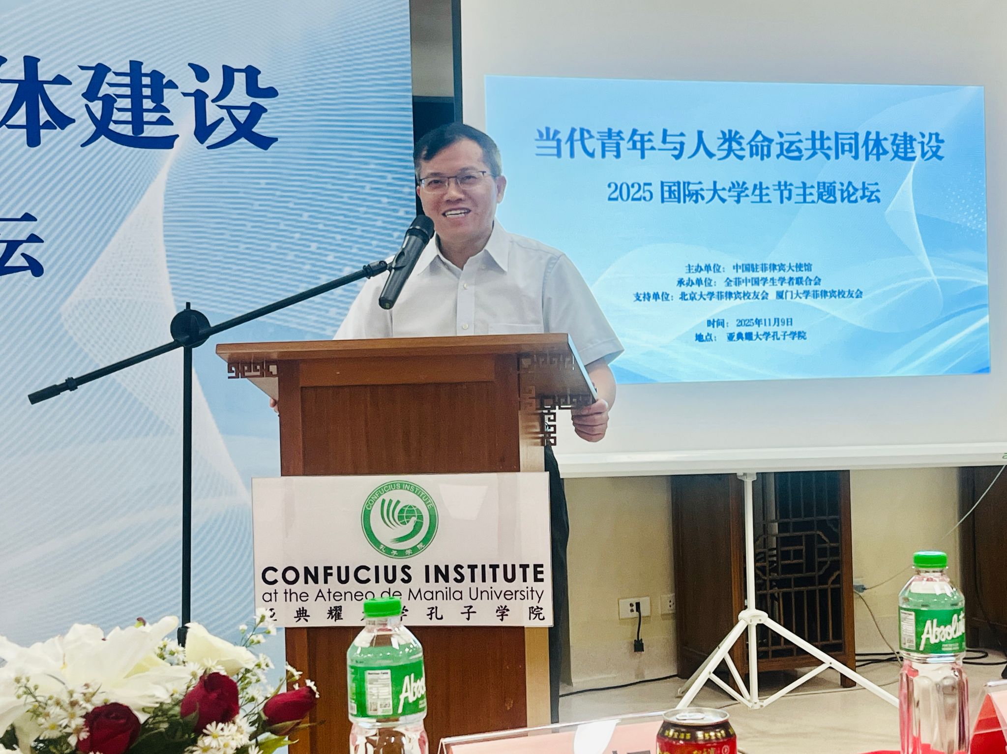11月9日,由中国驻菲律宾大使馆主办、全菲中国学生学者联合会承办的“当代青年与人类命运共同体建设”2025国际大学生节主题论坛,在亚典耀大学孔子学院顺利举行。中国驻菲律宾大使馆参赞熊胜、北京大学菲律宾校友会会长潘露莉、厦门大学菲律宾校友会副会长肖奕、亚典耀大学孔院中方院长黄林军、红溪礼示大学孔院中方院长杨正超、全菲中国学联活动部部长魏玉彪等嘉宾出席论坛。菲律宾大学孔子学院(以下简称“菲大孔院”)教师代表丁峰参加此次活动并分享主旨演讲。