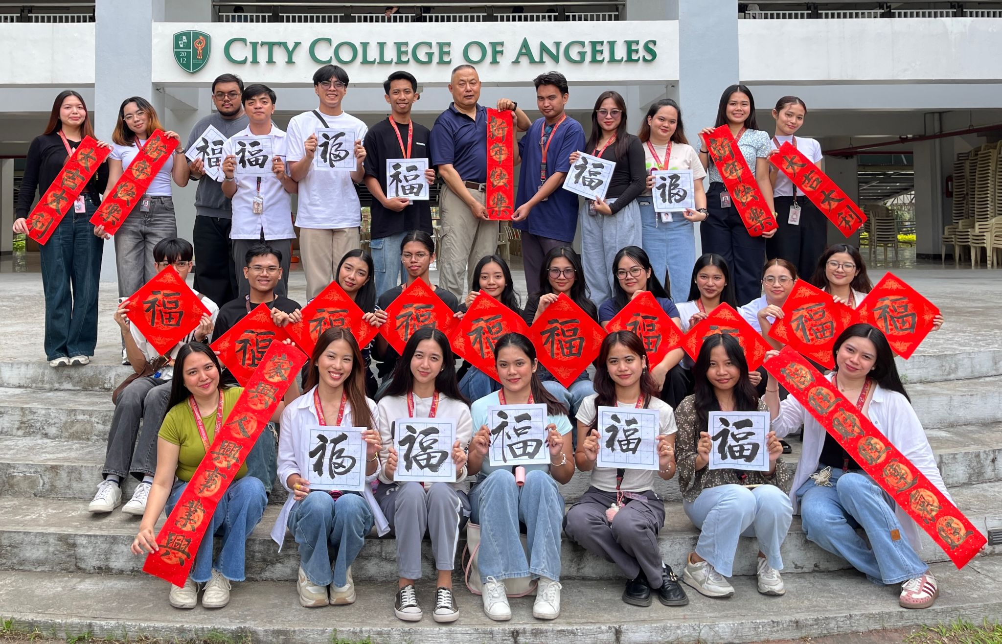 活动最后,学生们手捧着墨迹未干的“福”字、大红春联及新年条幅,齐聚安吉利斯城市学院小广场前合影留念,定格这一文化交融的美好瞬间。热闹的现场吸引了众多过往师生驻足围观。