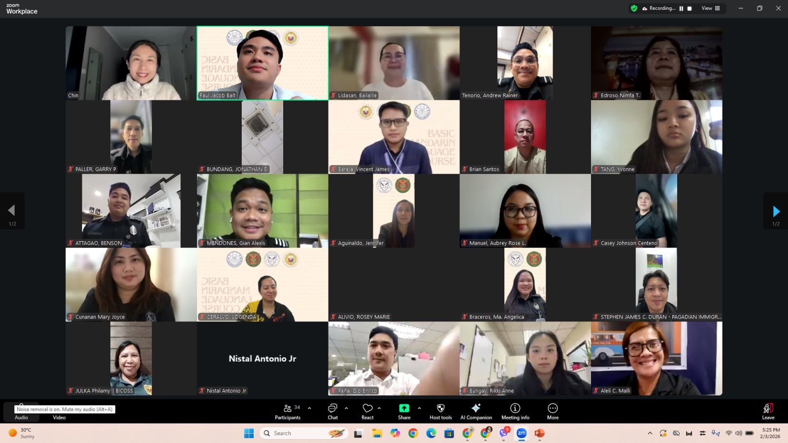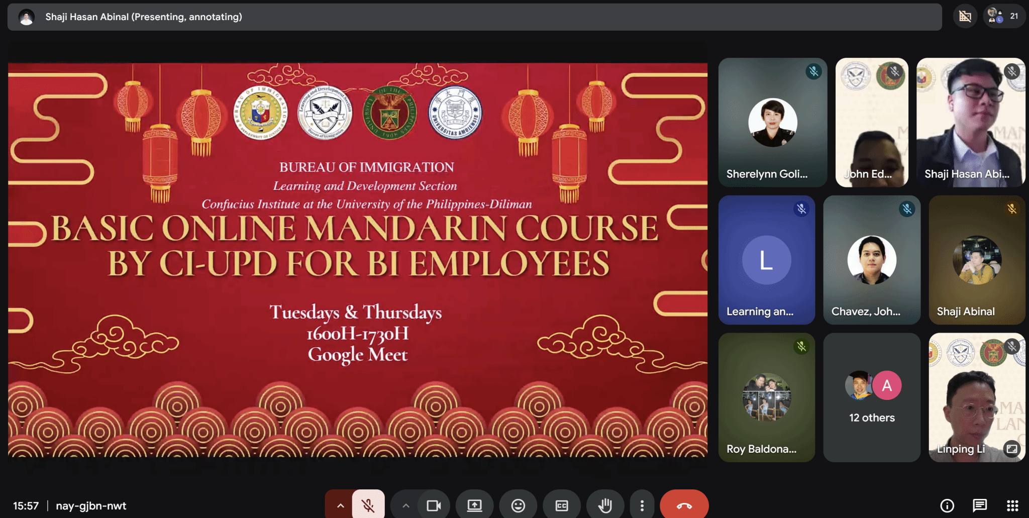 该课程源于菲律宾移民局学习发展处(Learning and Development Section)对提升移民局人员语言能力的需求。2个多月前,移民局相关项目主管专门到访孔院协商课程计划。在课程筹备期间,菲大孔院挑选出秦业乾与李林平两名教师,邀请移民局学习发展处协调员,共同梳理课程大纲、细化课程目标、敲定课程细节。由于报名火爆,该课程最终分为2个平行班,将每班学员数量控制在40人以内,采用线上、线下相结合的教学模式,共计24节课,每节课1.5小时。课程除涵盖汉语发音、基础语法、日常用语、旅行与身份相关词汇等常规内容外,还针对移民局一线办事人员工作所涉交际内容与话题进行扩展,旨在帮助学员掌握基本的汉语听说读写能力,能够在工作中与中国游客进行简单的交流。课程同时鼓励学员结课后报名参加HSK考试,以评估学习效果。