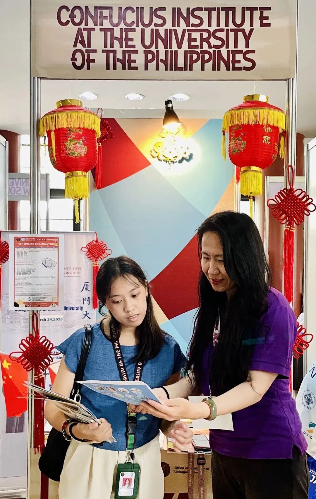 当天,展会重点推介了亚太地区的高校与机构的各类交流项目。作为展示中国高等教育与中文教育的重要平台,菲律宾大学孔子学院为本次展会准备了丰富详实的宣传资料,并在现场布置了富有中国特色的展示展台。工作人员面向来访学生,系统介绍了以厦门大学为代表的中国高校国际学生招生政策,同时展示了孔子学院开设的中文课程、HSK 考试等相关项目,帮助学生全面了解从中文学习、语言考试到赴华留学深造的完整路径。