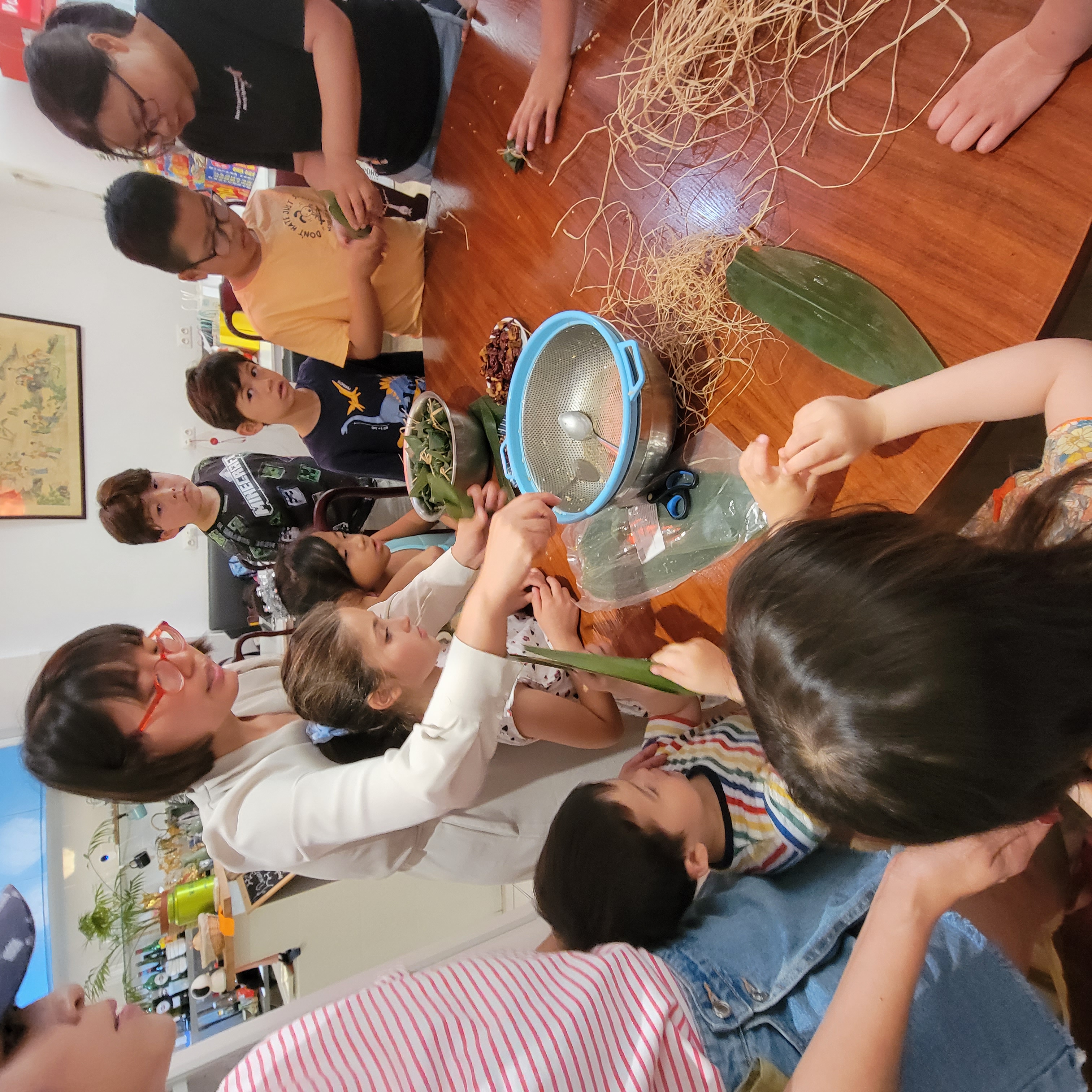 老师带着学生们包粽子