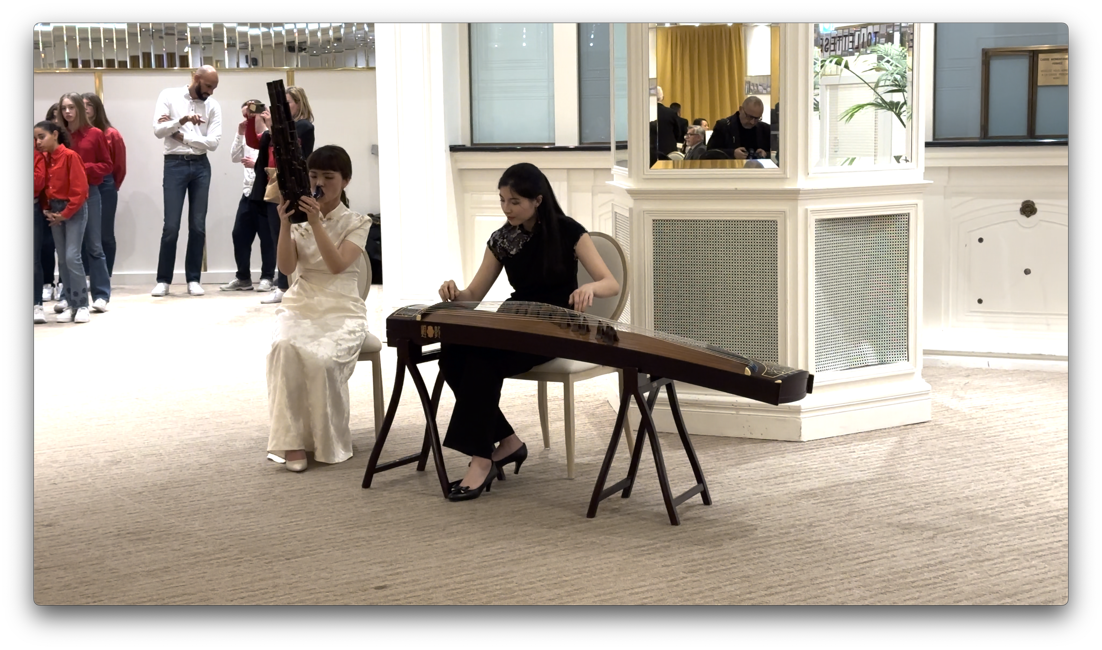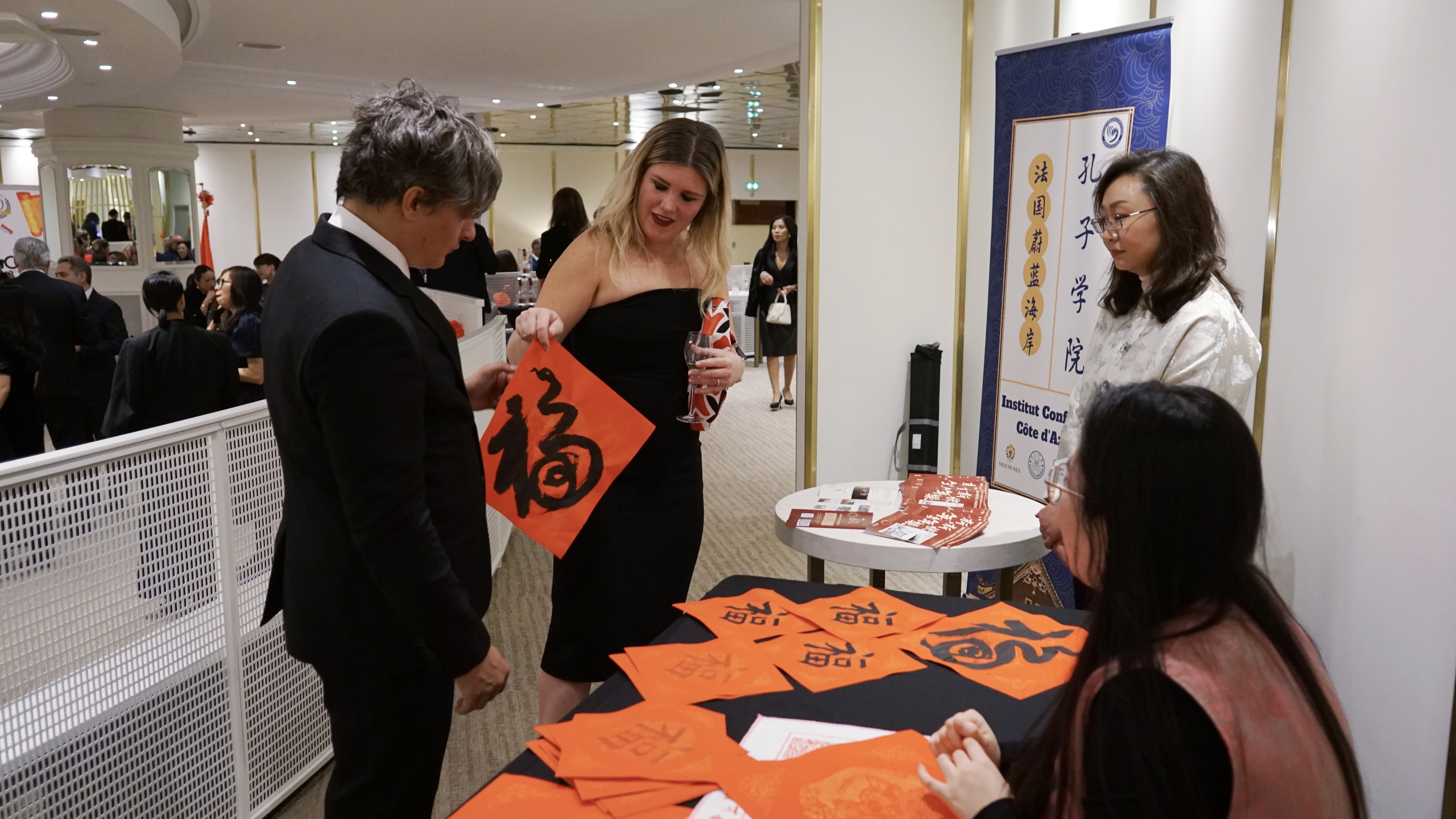 蔚蓝海岸孔子学院为晚宴倾情奉献了一台精彩纷呈的文艺演出。两位青年艺术家张玲慈和李力安分别展示了中国传统乐器笙和古筝的独特魅力,随后合奏了一首中西合璧的《金蛇狂舞》庆祝蛇年新春。随后,在优雅的水袖舞蹈之后,摩纳哥查尔斯三世初中(Collège Charles III de Monaco)的学生们献上了中文合唱。晚宴期间还穿插了《敦煌飞天》以及《莲鼓越歌行》等精彩的中国传统舞蹈节目。孔院设计的猜灯谜互动游戏环节让现场气氛持续高涨。晚宴在《汉唐盛世乐歌》的华美舞姿中圆满结束。