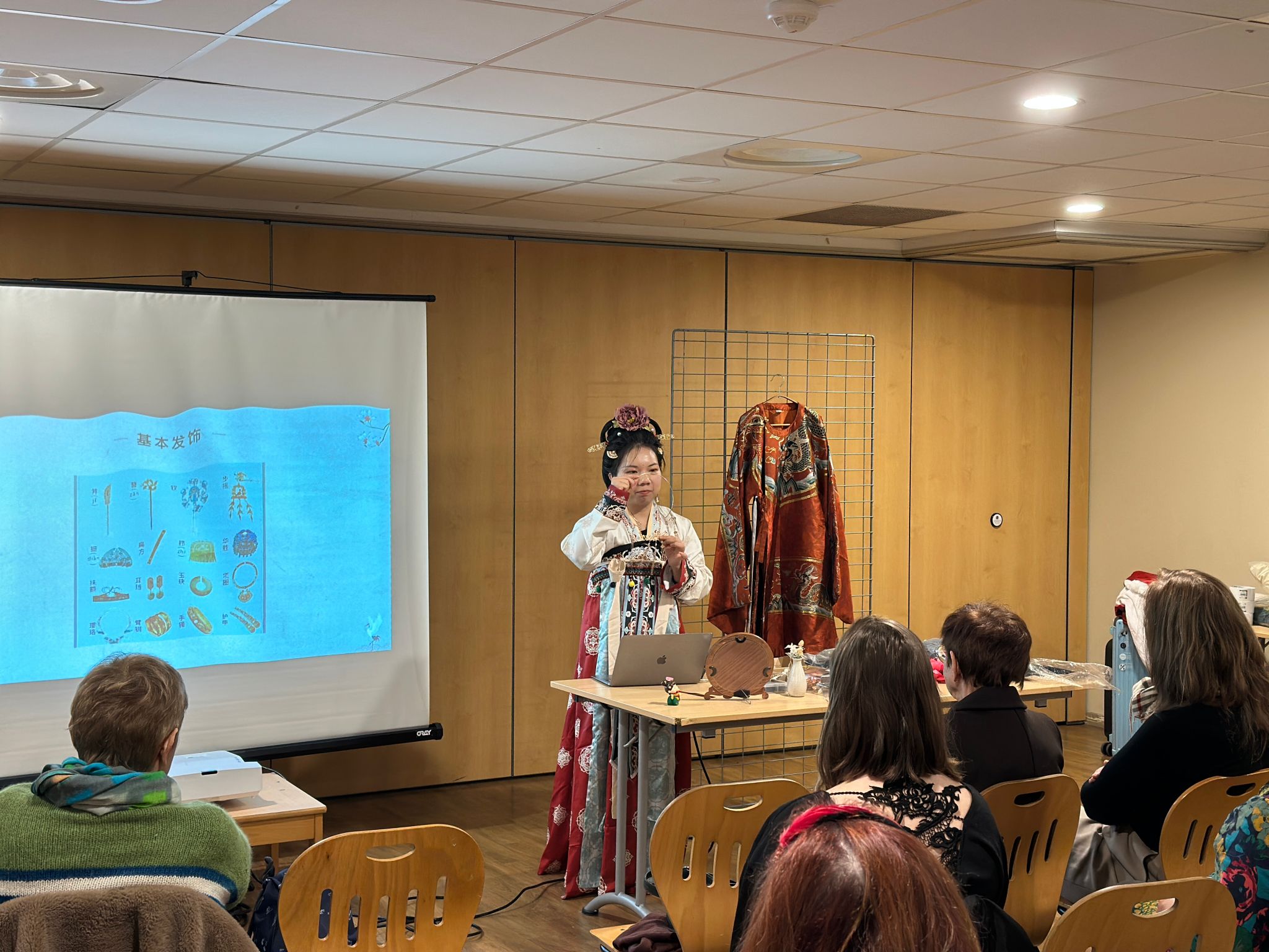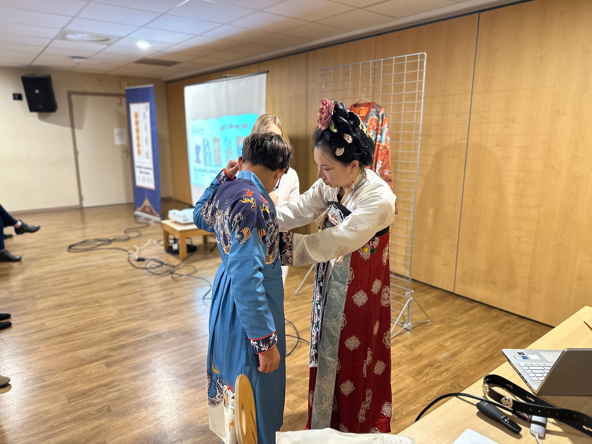 活动第一部分以汉服文化为主题,刘静从汉服的历史渊源切入,深入浅出地阐释了汉服与日本和服、韩国韩服的区别与关联。参与者们由此了解到,汉服作为汉民族传统服饰,其交领右衽、宽袍大袖的独特形制,蕴含着深厚的礼仪文化内涵。随后,刘静详细解读了汉服常见传统纹样的象征意义。无论是寓意吉祥的云纹、龙凤纹,还是象征高洁品格的梅兰竹菊纹,每一种纹样都承载着中华民族独树一帜的审美情趣。在试穿体验环节,参与者们在老师的指导下学习汉服穿着与系带技巧,亲身感受传统服饰的典雅庄重之美。不少法国友人换上飘逸的汉服后,纷纷赞叹其独特的东方韵味,争相拍照留念。