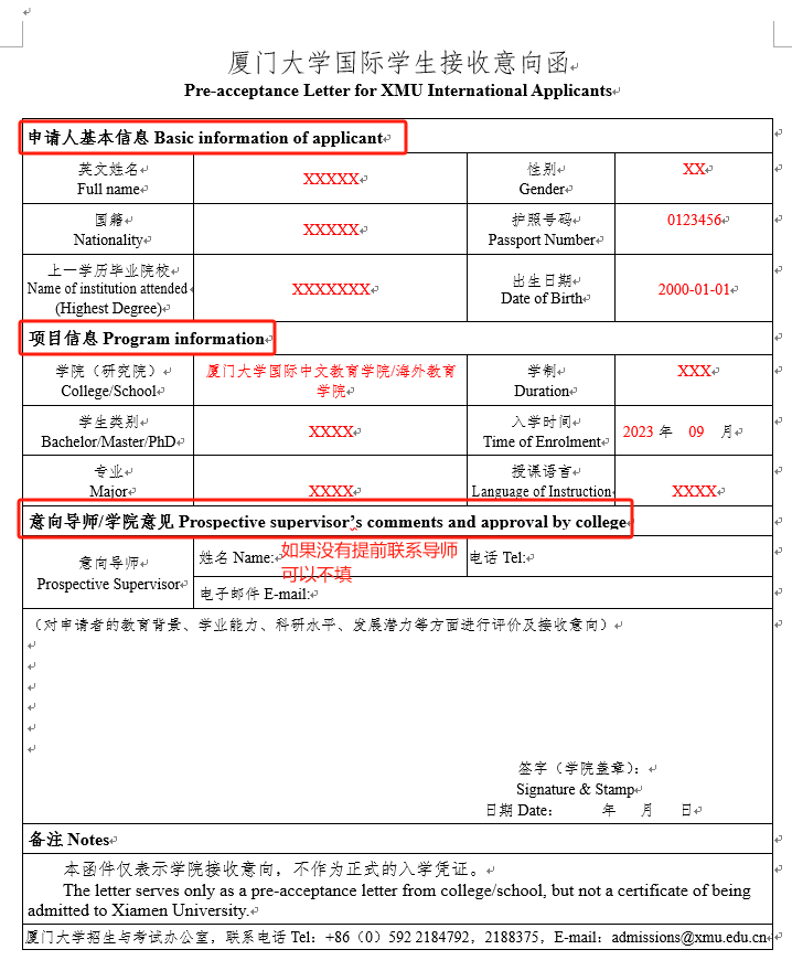 厦门大学国际学生接收意向函(点击下载)