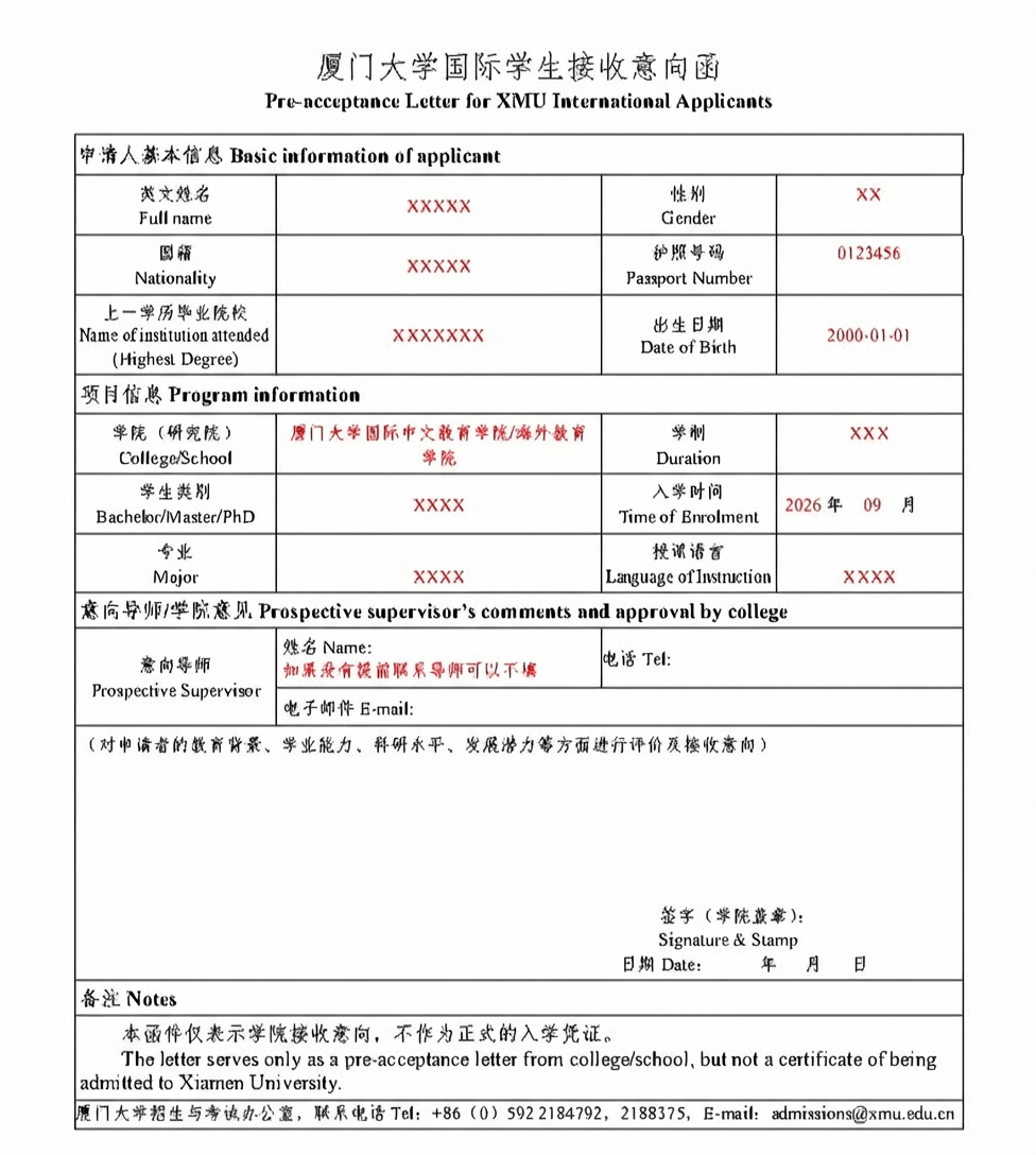 厦门大学国际学生接收意向函(点击下载)