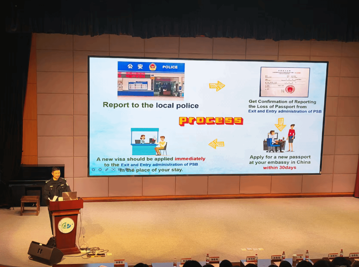 仪式结束后,厦门市出入境管理局苏一强警官为全体国际新生开展了涉外法律法规专题教育。苏警官结合留学生活实际,详细讲解了居留手续办理、住宿登记要求、护照遗失补办流程、转学及毕业离校手续等与国际学生切身利益相关的事项,并重点说明了关于非法就业、非法居留等行为的界定与法律后果。苏警官还特别提醒同学们,在自身安全受到侵害时,务必通过正规渠道寻求帮助,增强安全意识和法律意识,确保在华学习生活顺利、平安。