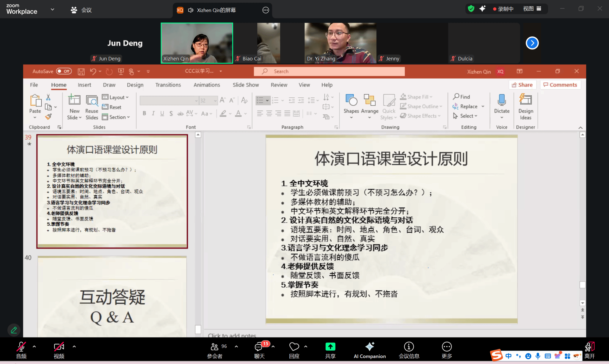 活动最后,张翼点评讲座并主持互动环节。与会者就中文交流语境分类、预习时间规划、跨文化差异应对及体演文化教学法线上适配性等问题深入交流。中心参会教师表示,通过本次示范课讲座,他们更加清晰地认识到,教师可依托科学的教学设计、丰富的教学方法及《中文:在文化中交流》学材体系,高效构建真正以学习者为中心的体演文化课堂。